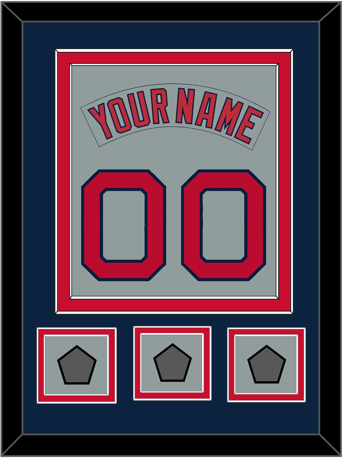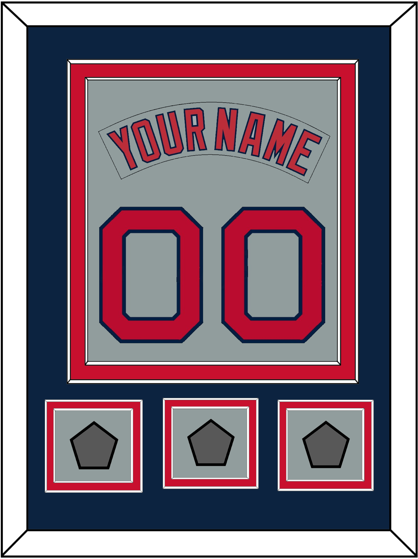 Boston Road Gray Jersey (1992 Through 2008) Nameplate & Number (From The Back Of The Jersey) With World Series Champions Patches; 2004, 2007 & 2013, Or 2007, 2013 & 2018. Double Mat Cut: Red Mat Over A Blue Mat. Gray Nameplate, Red Number & Patches Mounted On A Gray Mat. White Or Black Frame.