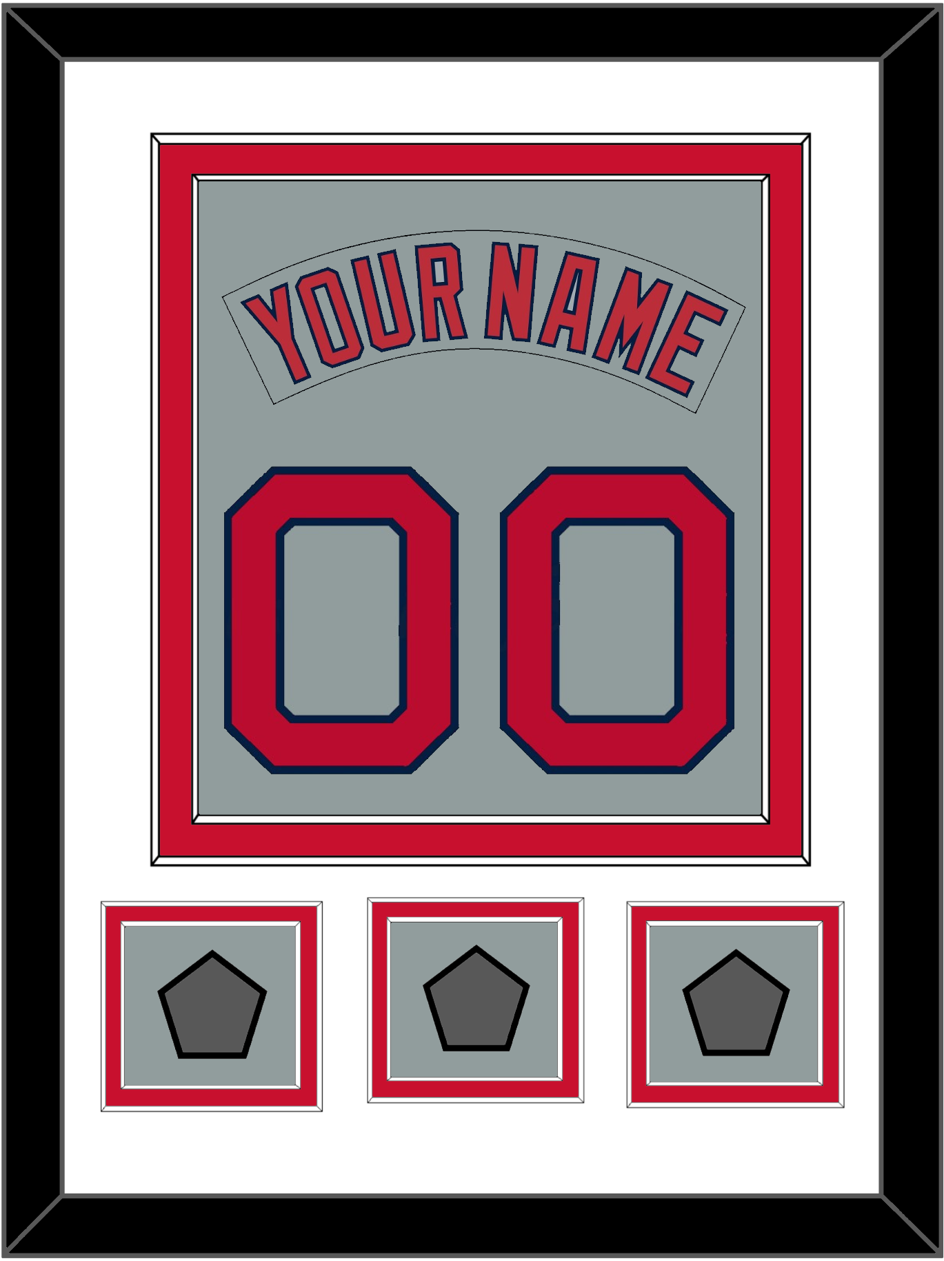 Boston Road Gray Jersey (1992 Through 2008) Nameplate & Number (From The Back Of The Jersey) With World Series Jersey Patches; 2004, 2007 & 2013, Or 2007, 2013 & 2018.  Double Mat Cut:  White Mat Over A Red Mat. Gray Nameplate, Red Number & Patches Mounted On A Gray Mat.  Black Frame.