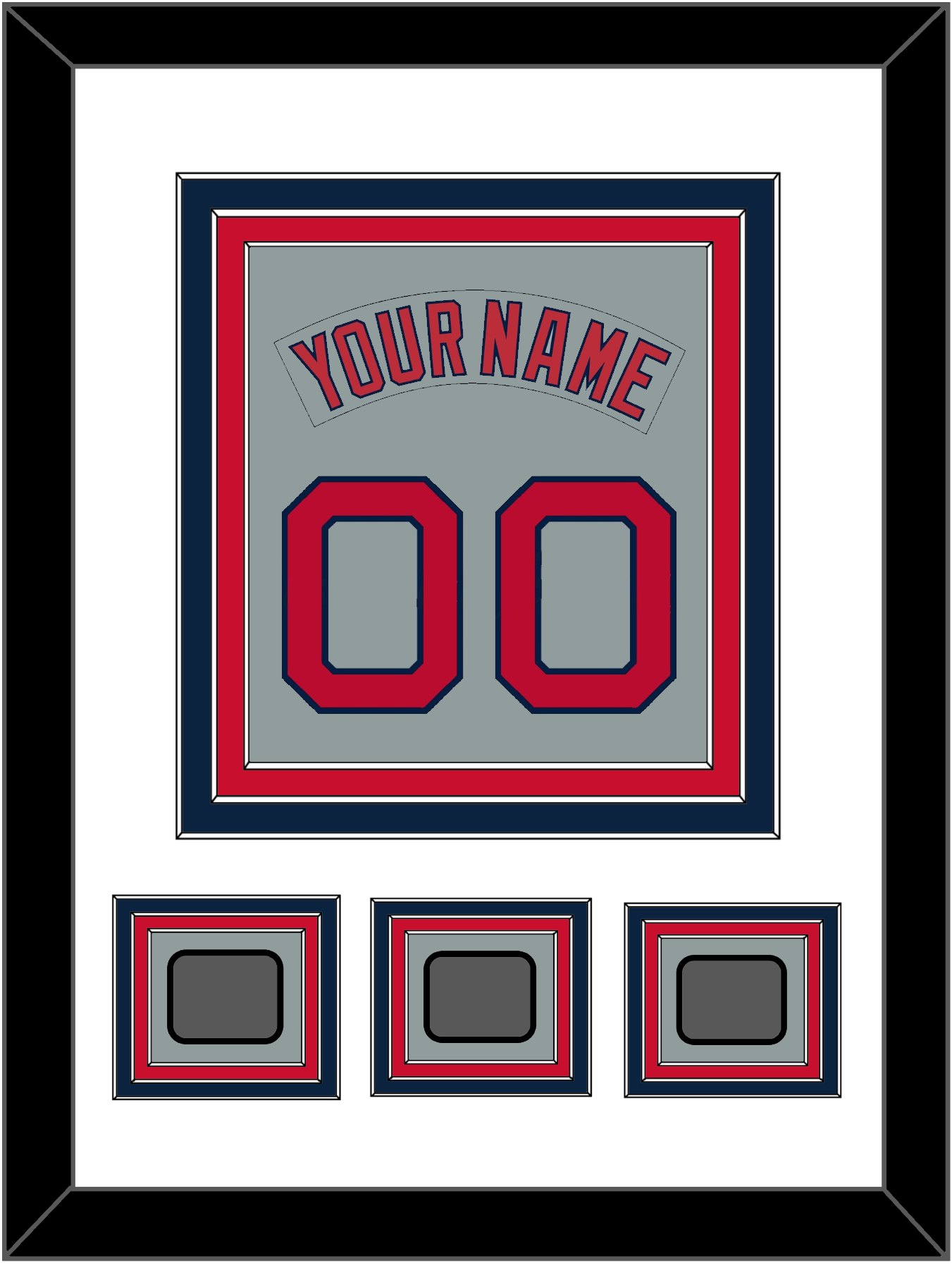 Boston Road Gray Jersey (1992 Through 2008) Nameplate & Number (From The Back Of The Jersey) With World Series Jersey Patches; 2004, 2007 & 2013, Or 2007, 2013 & 2018. Triple Mat Cut: White Mat Over A Blue Mat Over A Red Mat. Gray Nameplate, Red Number & Patches Mounted On A Gray Mat. Black Frame.