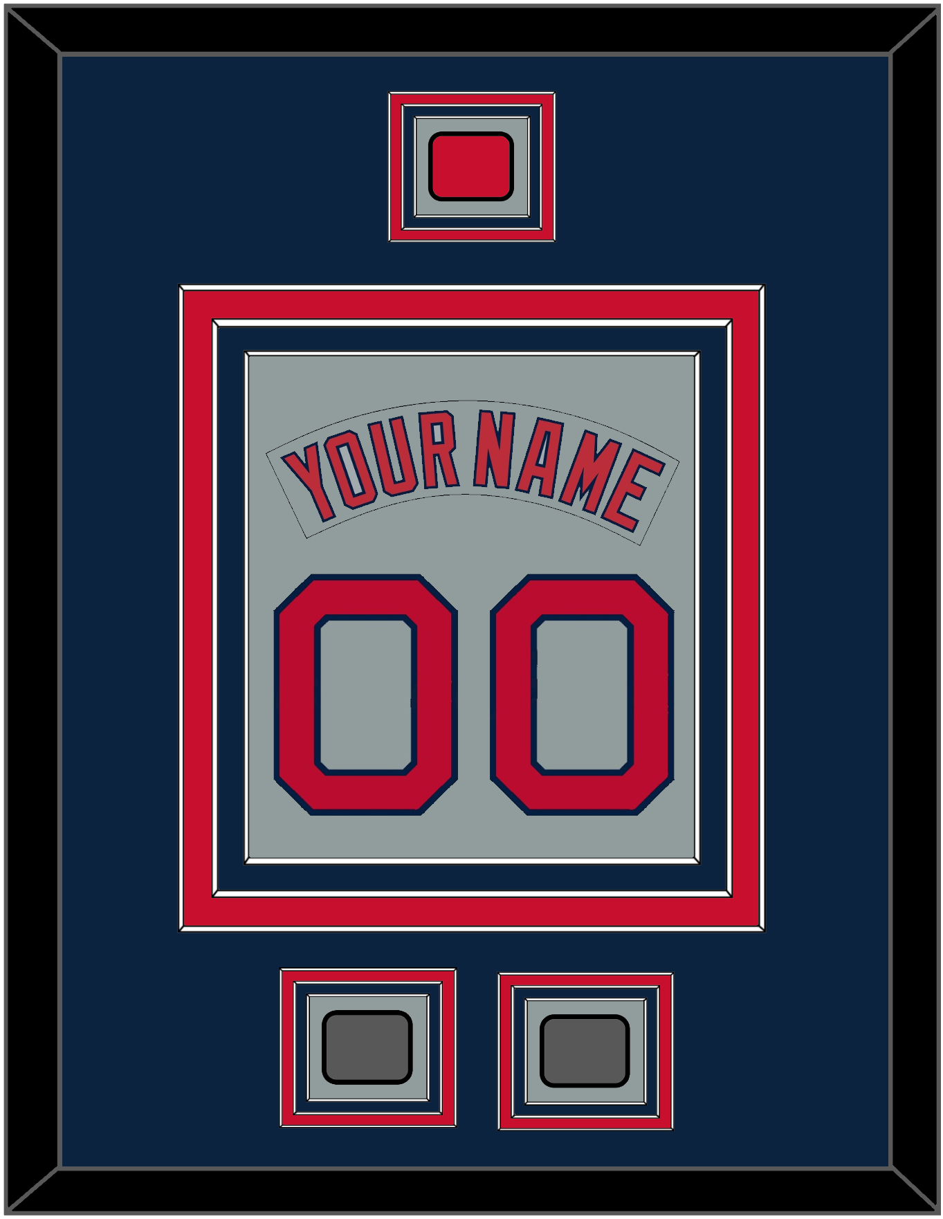Boston Road Gray Jersey (1992 Through 2008) Nameplate & Number (From The Back Of The Jersey) With Logo Patch From Sleeve And Two World Series Champions Patches; 2004 & 2007, 2007 & 2013 Or 2013 & 2018. Triple Mat Cut: Blue Mat Over A Red Mat Over A Blue Mat. Gray Nameplate, Red Number And Patches Mounted On A Gray Mat. White Or Black Frame.