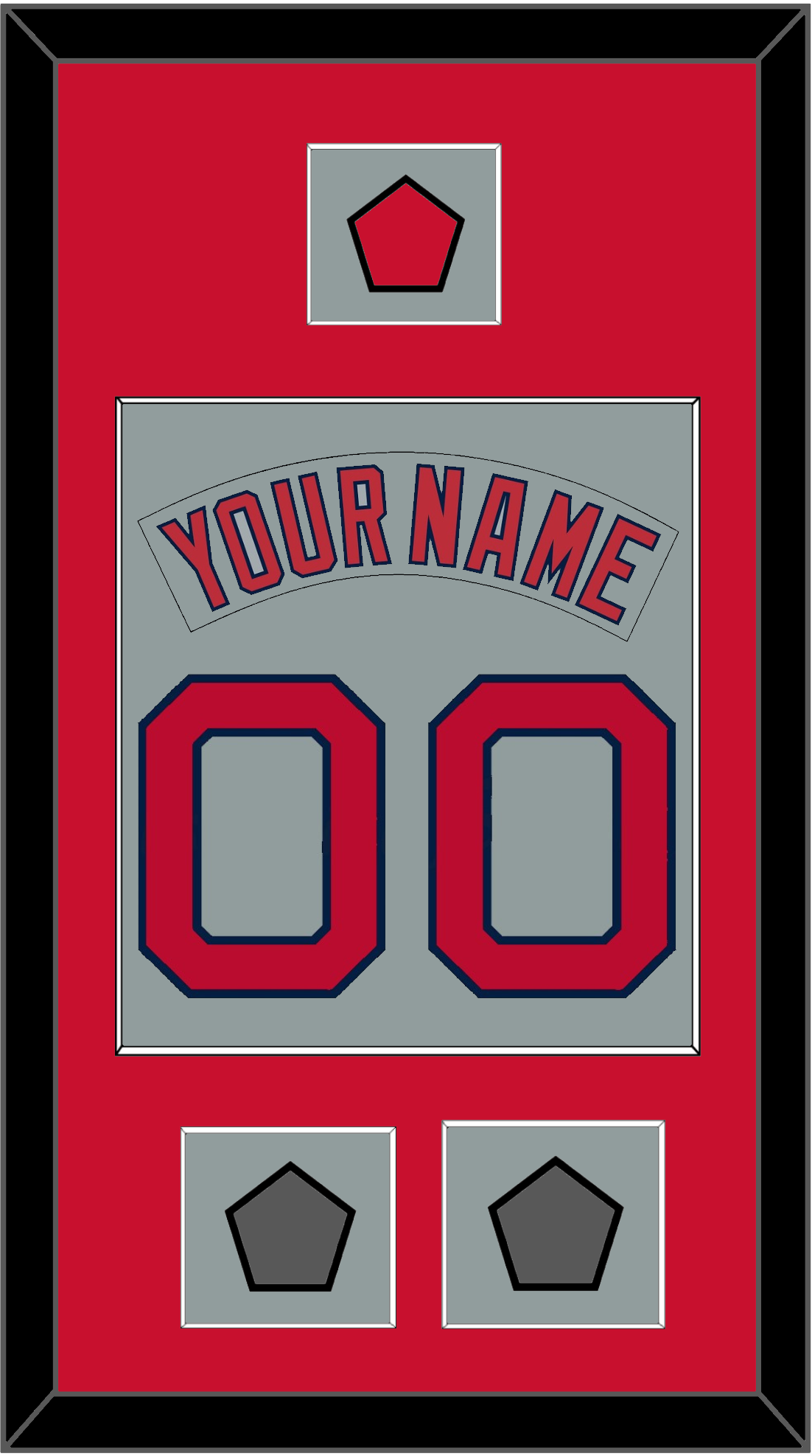 Boston Road Gray Jersey (1992 Through 2008) Nameplate & Number (From The Back Of The Jersey) With Logo Patch From Sleeve And Two World Series Jersey Patches; 2004 & 2007, 2007 & 2013 Or 2013 & 2018. Single Mat Cut: Red Mat With Gray Nameplate, Red Number And Patches Mounted On A Gray Mat. White Or Black Frame.