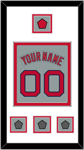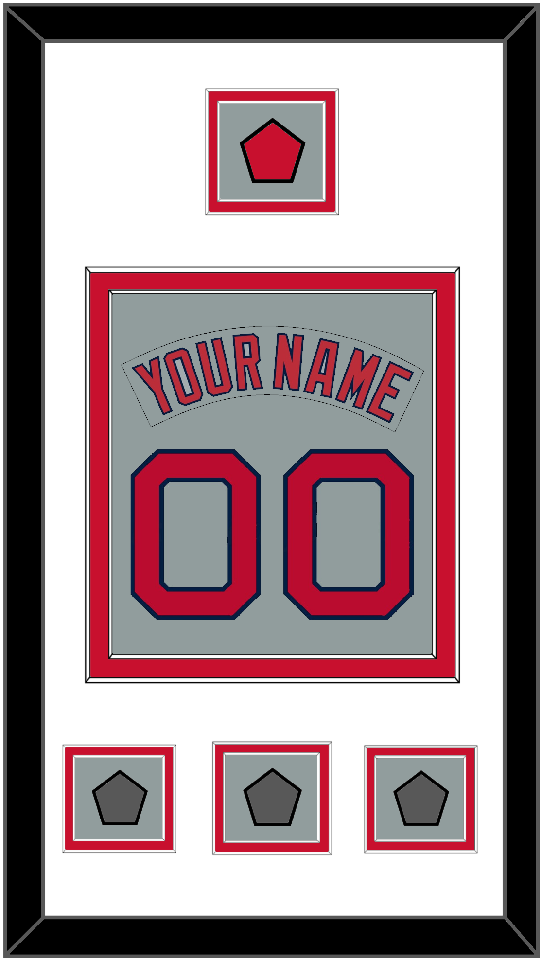 Boston Road Gray Jersey (1992 Through 2008) Nameplate & Number (From The Back Of The Jersey) With Logo Patch From Sleeve And Three World Series Champions Patches; 2004, 2007 & 2013 Or 2007, 2013 & 2018. Double Mat Cut: White Mat Over A Red Mat. Gray Nameplate, Red Number And Patches Mounted On A Gray Mat. Black Frame.