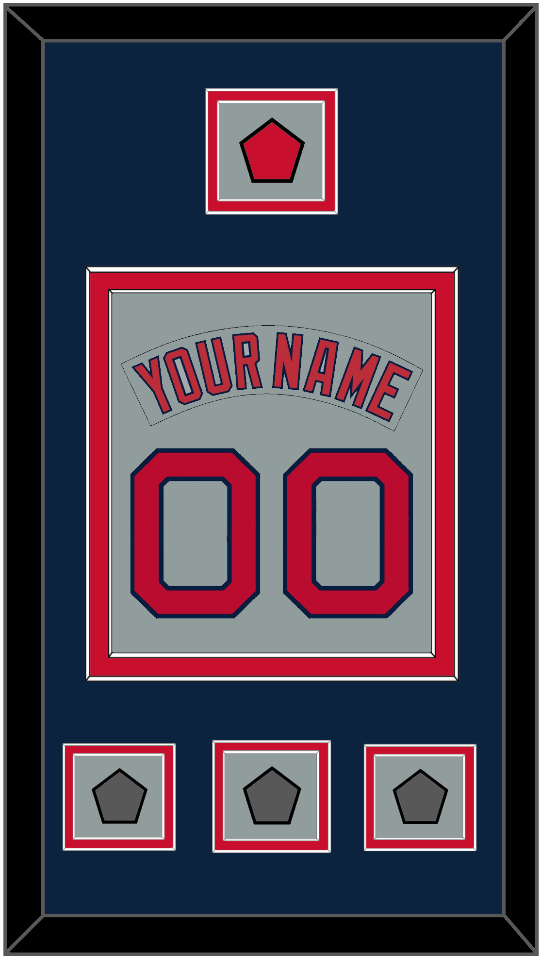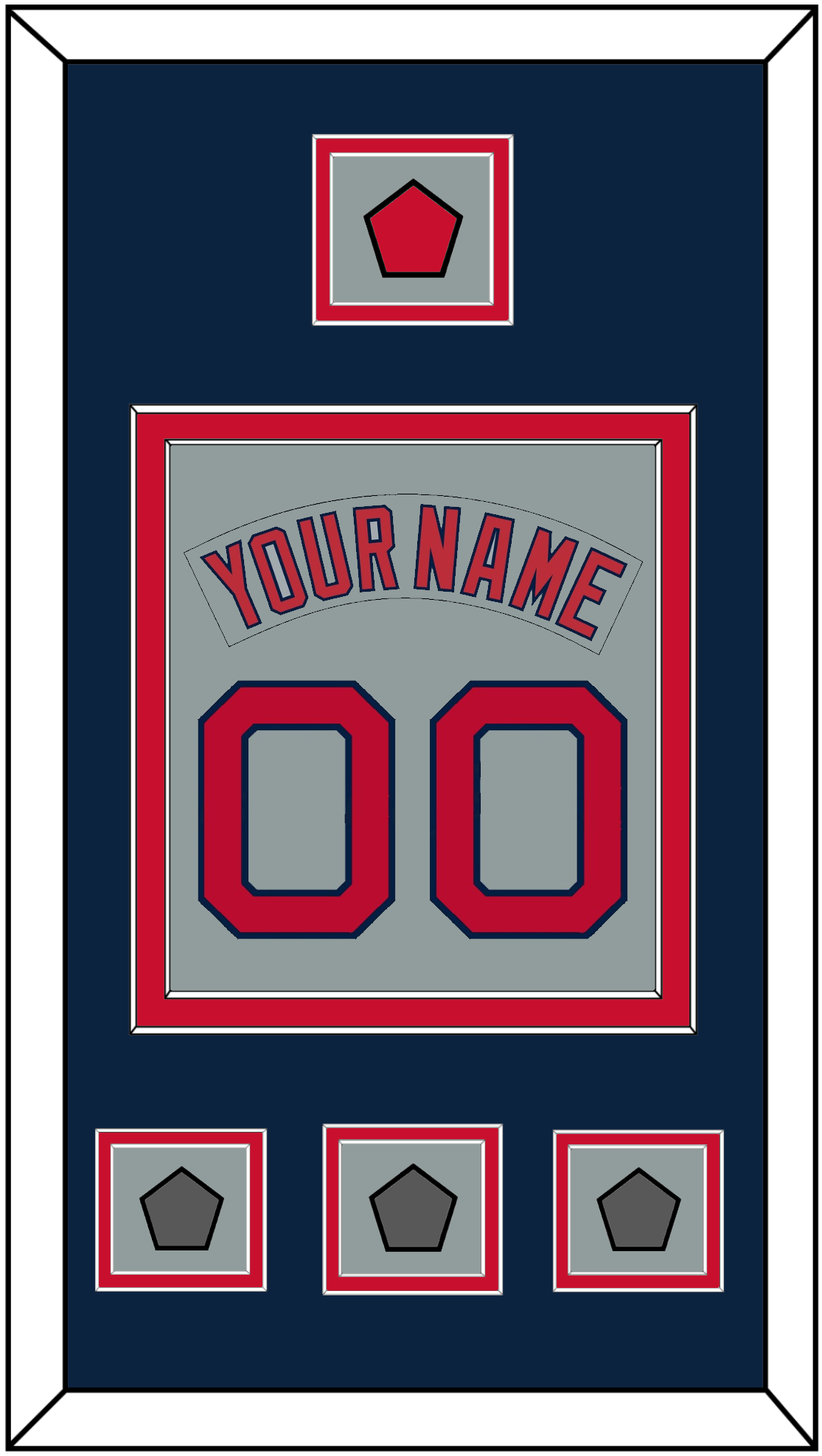 Boston Road Gray Jersey (1992 Through 2008) Nameplate & Number (From The Back Of The Jersey) With Logo Patch From Sleeve And Three World Series Champions Patches; 2004, 2007 & 2013 Or 2007, 2013 & 2018. Double Mat Cut: Blue Mat Over A Red Mat. Gray Nameplate, Red Number And Patches Mounted On A Gray Mat. White Or Black Frame.