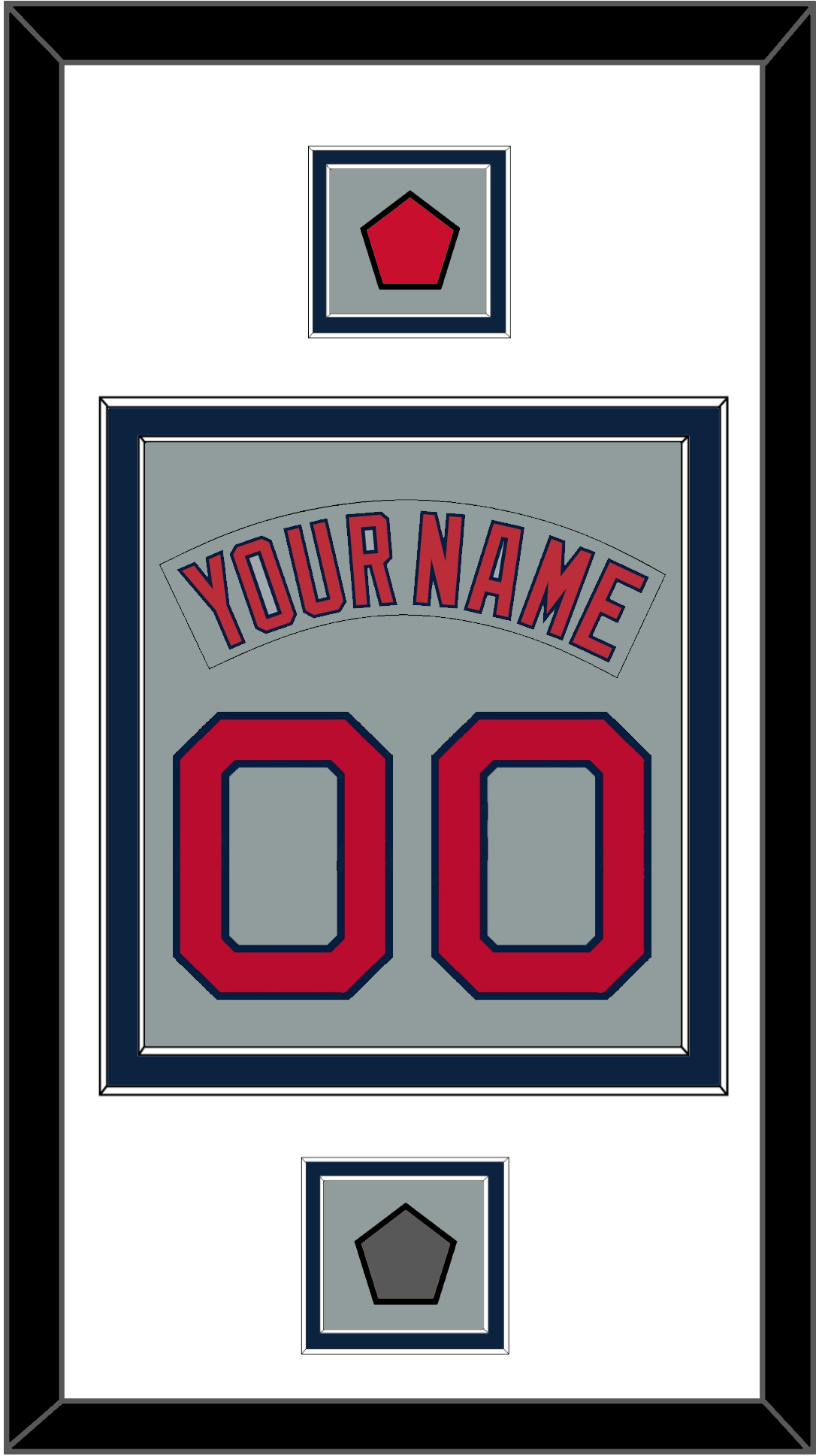 Boston Road Gray Jersey (1992 Through 2008) Nameplate & Number (From The Back Of The Jersey) With Logo Patch From Sleeve And World Series Champions Patch; 2004, 2007, 2013 Or 2018. Double Mat Cut: White Mat Over A Blue Mat. Gray Nameplate, Red Number And Patches Mounted On A Gray Mat. Black Frame.