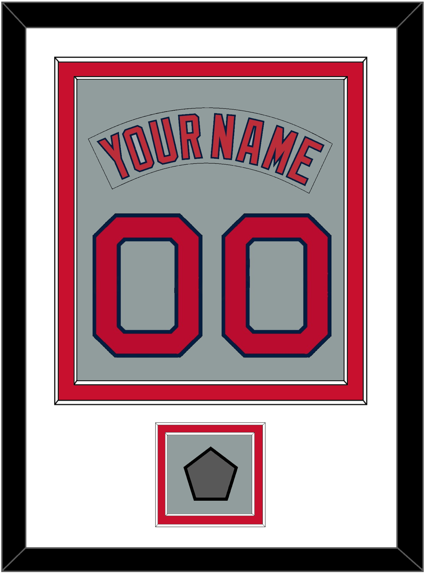 Boston Road Gray Jersey (1992 Through 2008) Nameplate & Number (From The Back Of The Jersey) With 2004, 2007, 2013 Or 2018 World Series Champions Patch. Double Mat Cut: White Mat Over A Red Mat. Gray Nameplate, Red Number & Patch Mounted On A Gray Mat. Black Frame.
