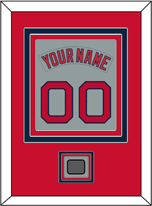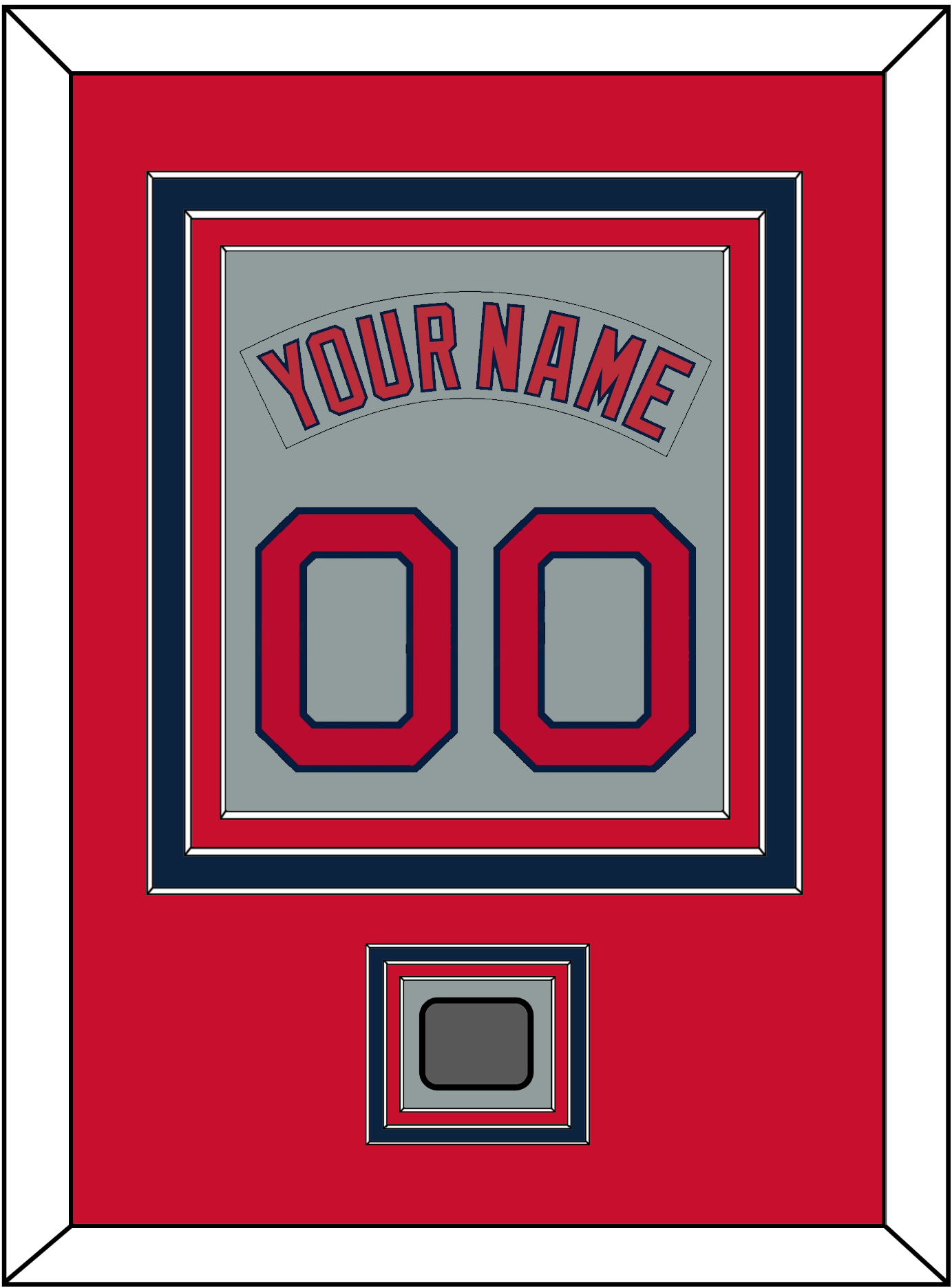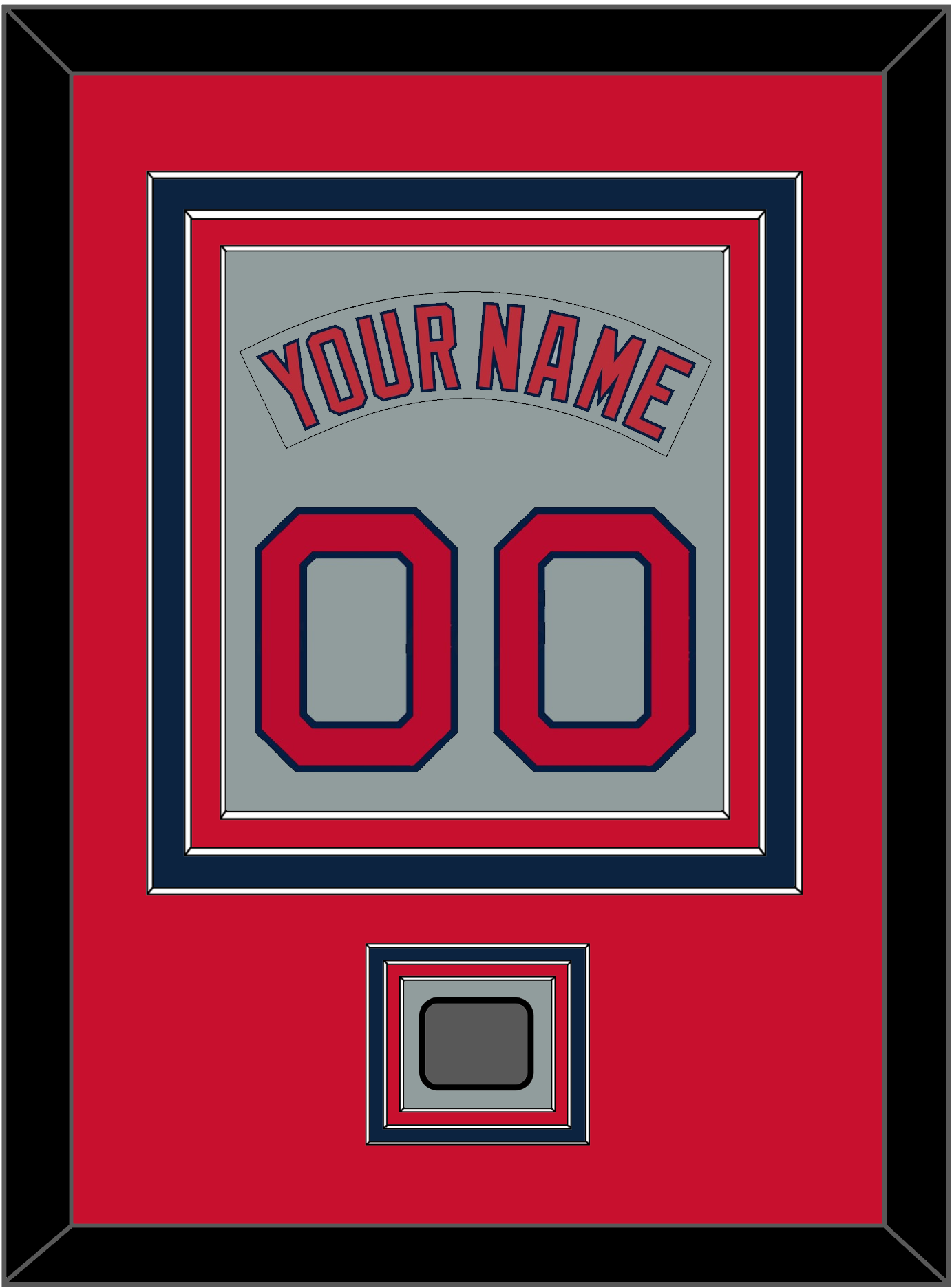 Boston Road Gray Jersey (1992 Through 2008) Nameplate & Number (From The Back Of The Jersey) With 2004, 2007, 2013 Or 2018 World Series Champions Patch. Triple Mat Cut: Red Mat Over A Blue Mat Over A Red Mat. Gray Nameplate, Red Number & Patch Mounted On A Gray Mat. White Or Black Frame.