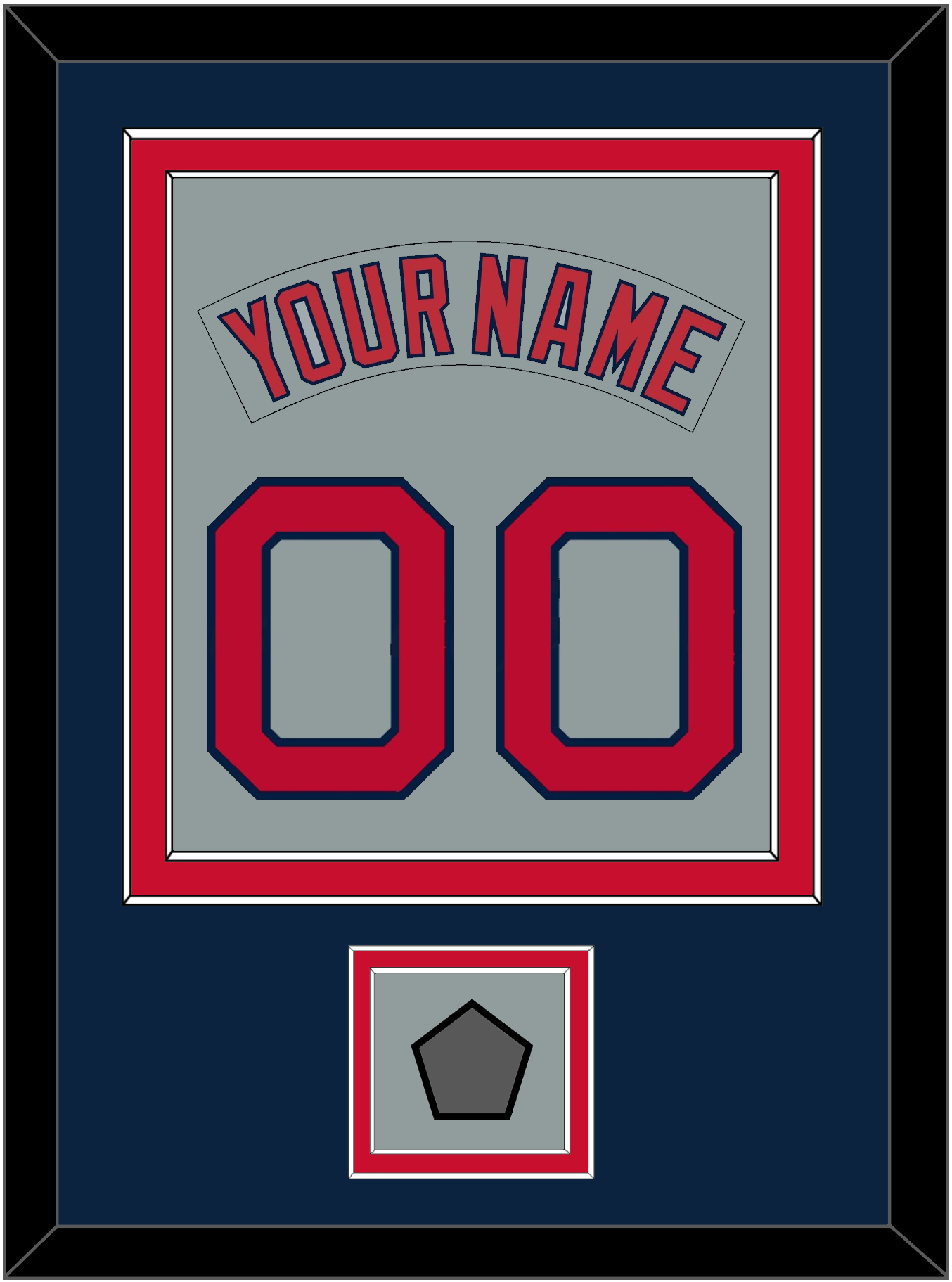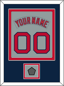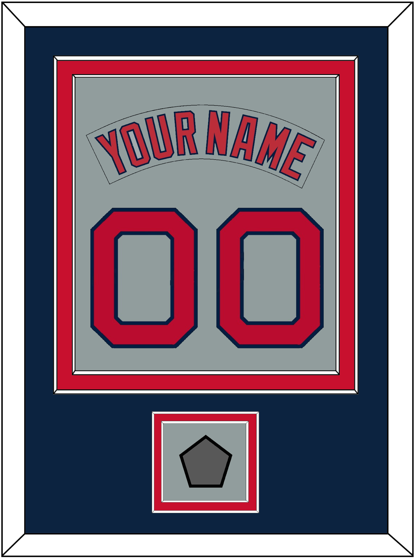 Boston Road Gray Jersey (1992 Through 2008) Nameplate & Number (From The Back Of The Jersey) With 2004, 2007, 2013 Or 2018 World Series Jersey Patch. Double Mat Cut: Blue Mat Over A Red Mat. Gray Nameplate, Red Number & Patch Mounted On A Gray Mat. White Or Black Frame.