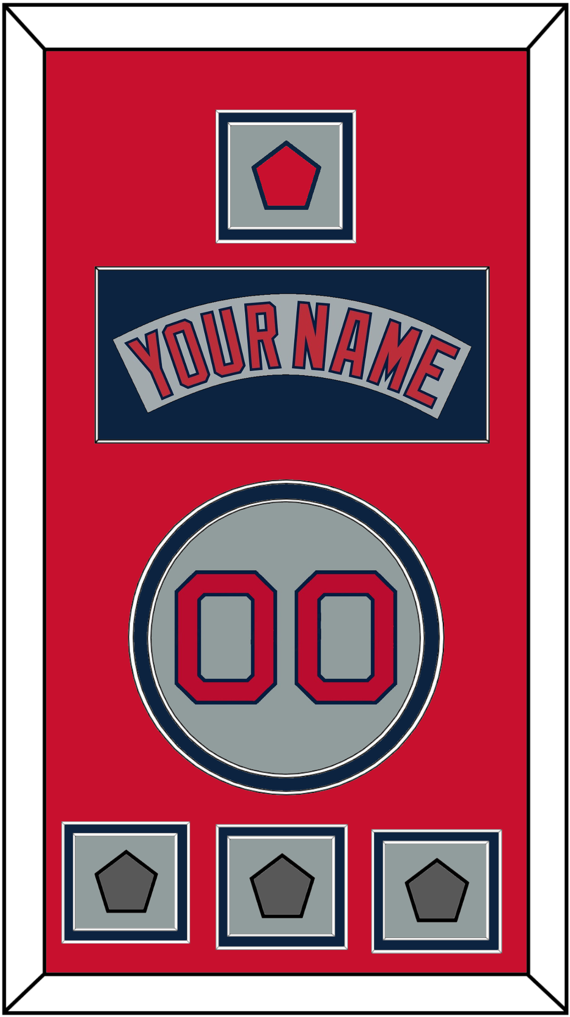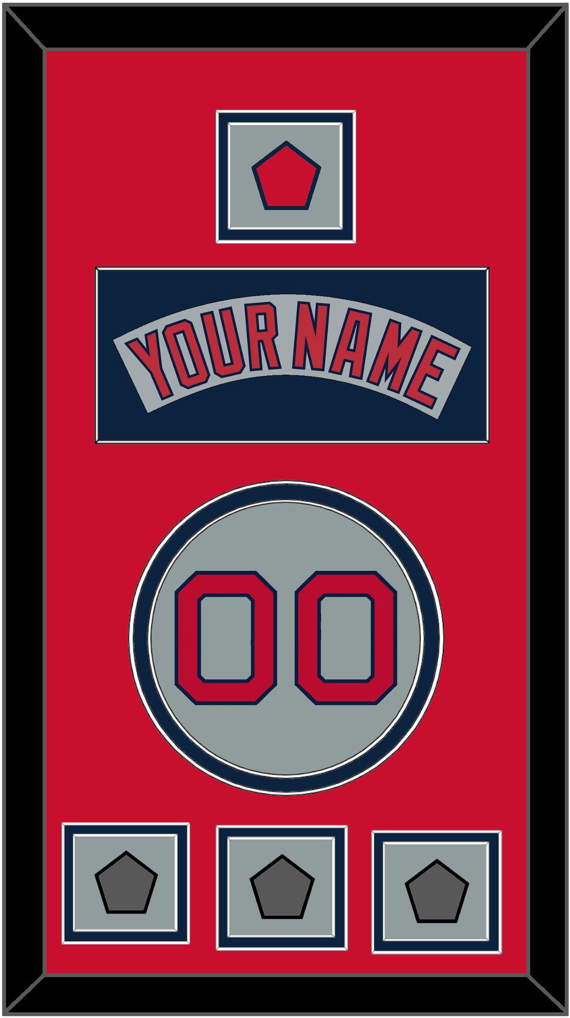 Boston Road Gray Jersey (1992 Through 2008) Nameplate, Number, Logo Sleeve Patch And Three World Series Champions Patches (2004, 2007 & 2013 Or 2007, 2013 & 2018). Nameplate Is Single Mat Cut: Red Mat With Gray Nameplate Mounted On A Blue Mat. To Match The Jersey, Number And Patches Are Double Mat Cut: Red Mat Over A Blue Mat, Red Number & Patches Mounted On A Gray Mat. White Or Black Frame.