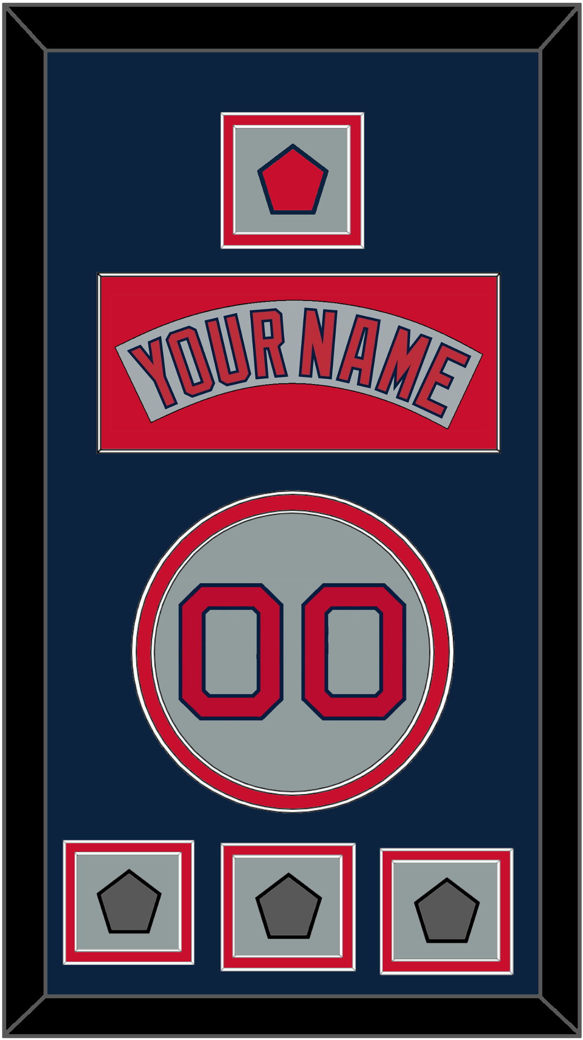 Boston Road Gray Jersey (1992 Through 2008) Nameplate, Number, Logo Sleeve Patch And Three World Series Champions Patches (2004, 2007 & 2013 Or 2007, 2013 & 2018). Nameplate Is Single Mat Cut: Blue Mat With Gray Nameplate Mounted On A Red Mat. To Match The Jersey, Number And Patches Are Double Mat Cut: Blue Mat Over A Red Mat, Red Number & Patches Mounted On A Gray Mat. White Or Black Frame.