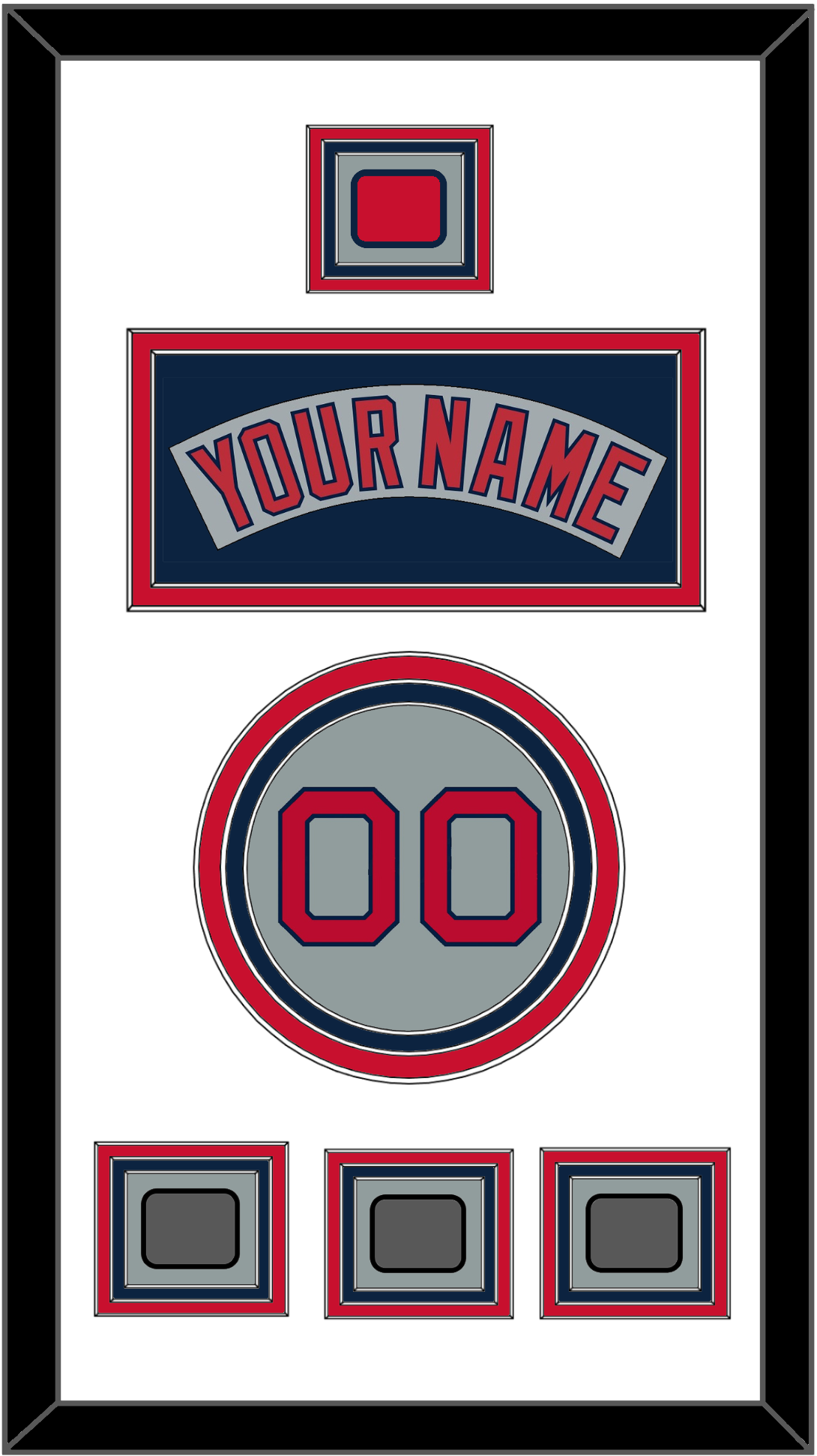 Boston Road Gray Jersey (1992 Through 2008) Nameplate, Number, Logo Sleeve Patch And Three World Series Champions Patches (2004, 2007 & 2013 Or 2007, 2013 & 2018).  Nameplate Is Double Mat Cut:  White Mat Over A Red Mat.  Gray Nameplate Mounted On A Blue Mat.  To Match The Jersey, Number And Patches Are Triple Mat Cut:  White Mat Over A Red Mat Over A Blue Mat.  Red Number & Patches Mounted On A Gray Mat.  Black Frame.