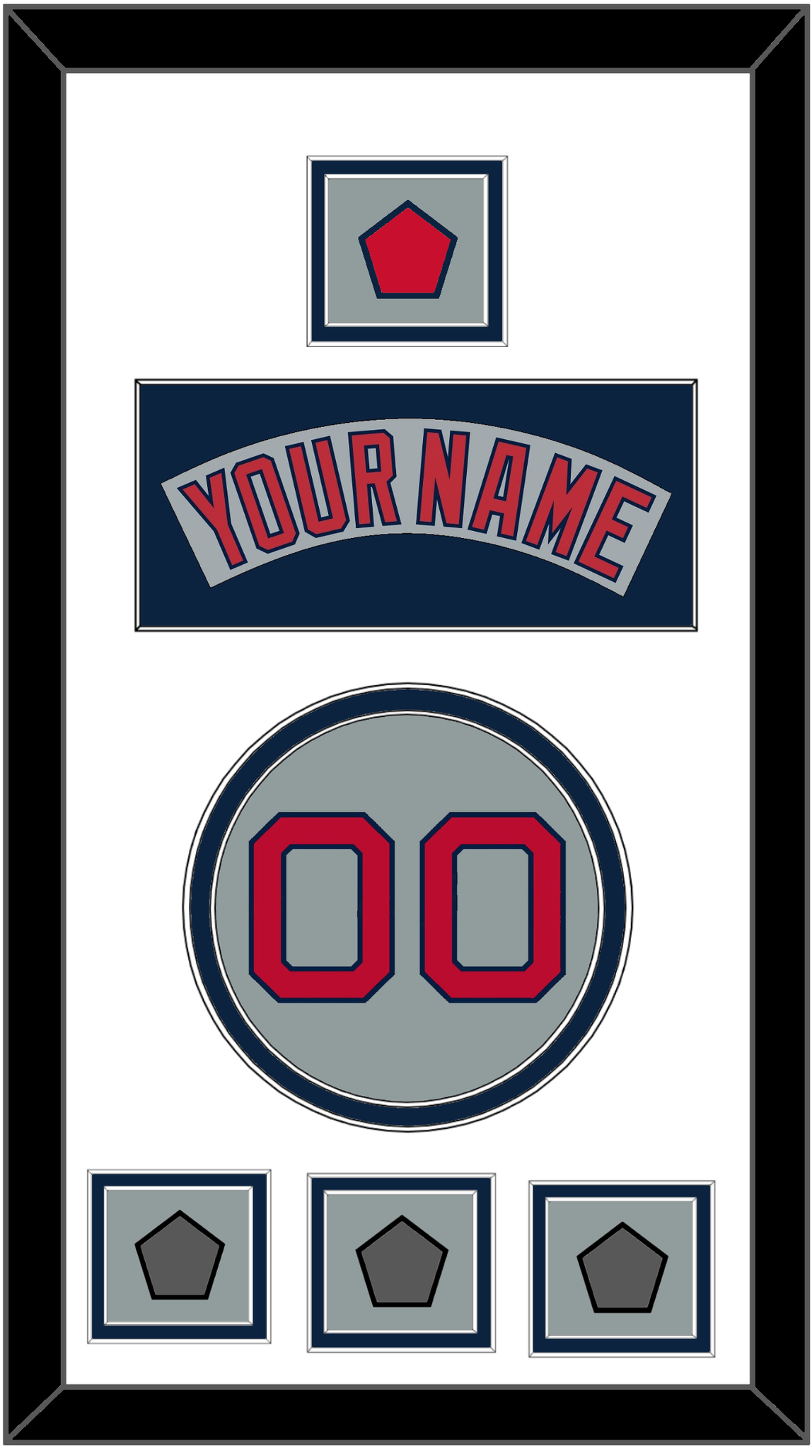 Boston Road Gray Jersey (1992 Through 2008) Nameplate, Number, Logo Sleeve Patch And Three World Series Jersey Patches (2004, 2007 & 2013 Or 2007, 2013 & 2018). Nameplate Is Single Mat Cut: White Mat With Gray Nameplate Mounted On Blue Mat. To Match The Jersey, Number And Patches Are Double Mat Cut: White Mat Over A Blue Mat, Red Number & Patches Mounted On A Gray Mat. Black Frame.