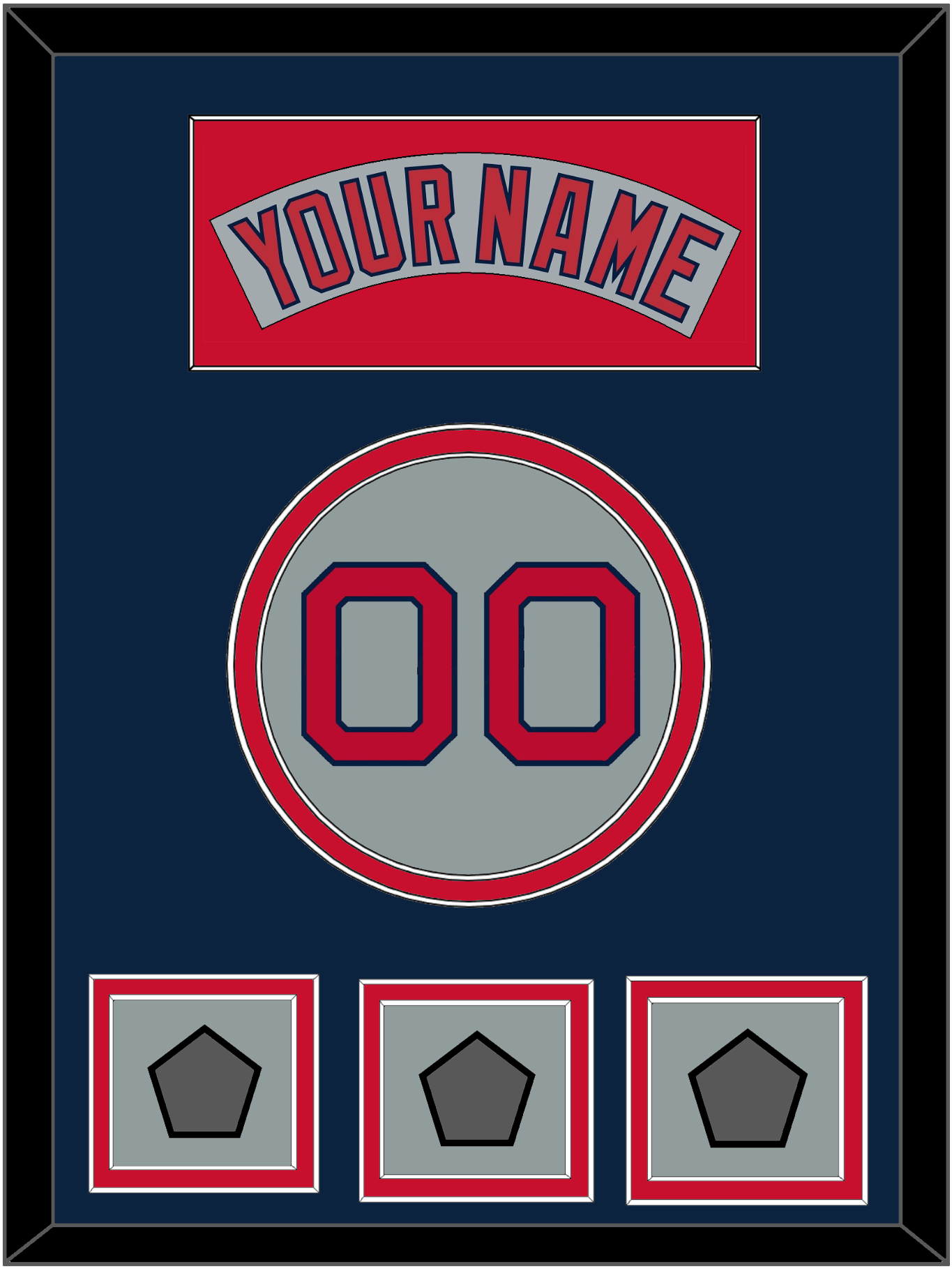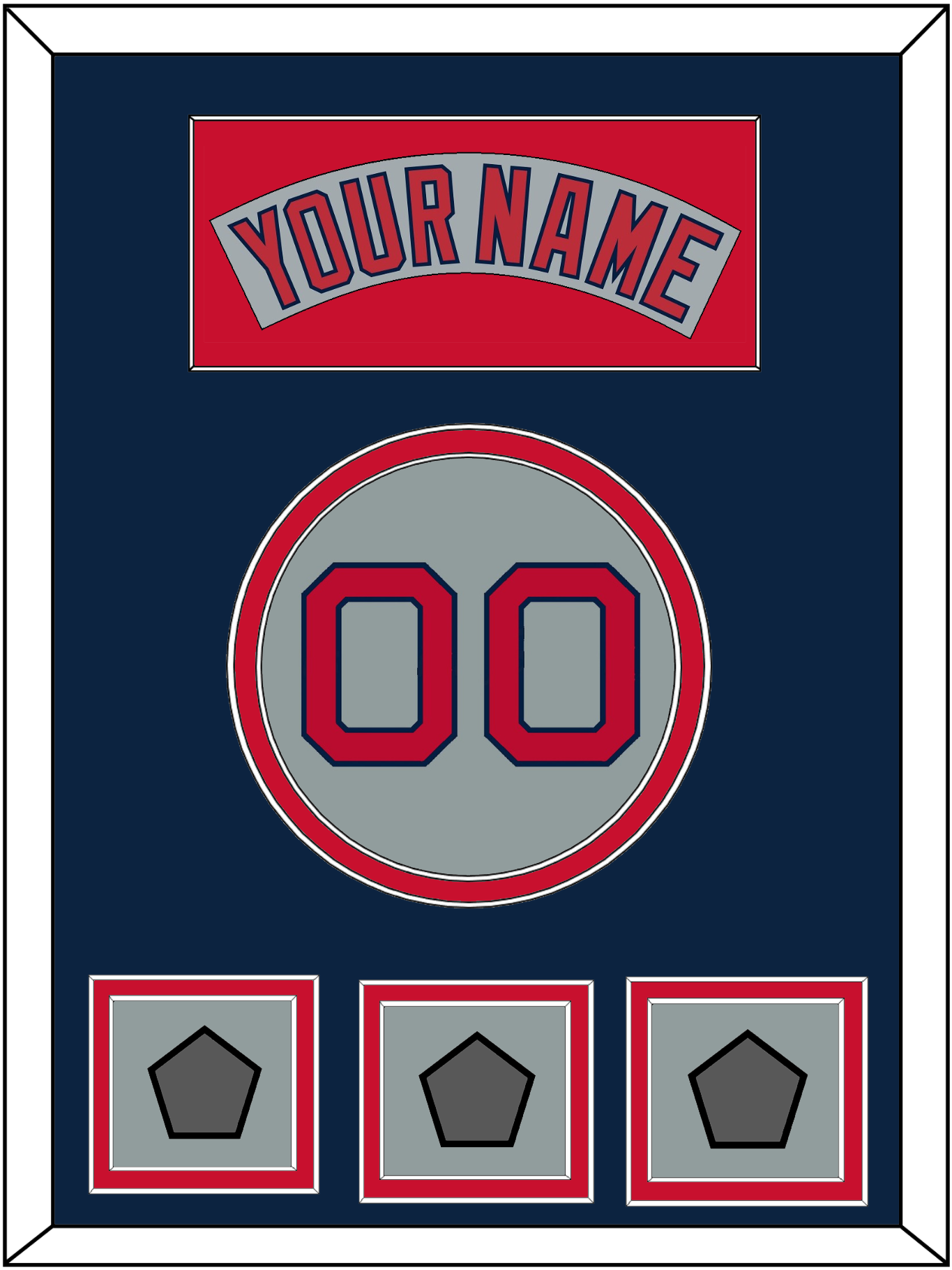 Boston Road Gray Jersey (1992 Through 2008) Nameplate & Number With Three World Series Jersey Patches (2004, 2007 & 2013 Or 2097, 2013 & 2018). Nameplate Is Single Mat Cut: Blue Mat With Gray Nameplate Mounted On A Red Mat. To Match The Jersey, Number And Patches Are Double Mat Cut: Blue Mat Over A Red Mat, Red Number & World Series Patch Mounted On A Gray Mat. White Or Black Frame.