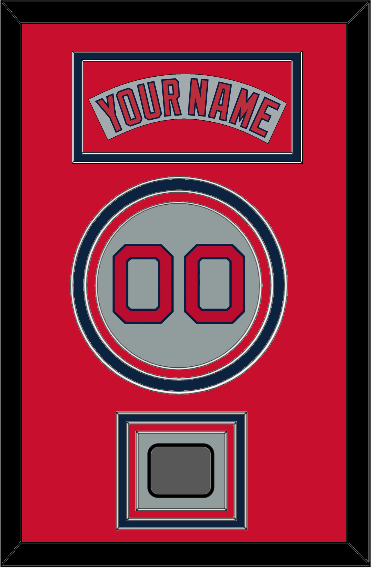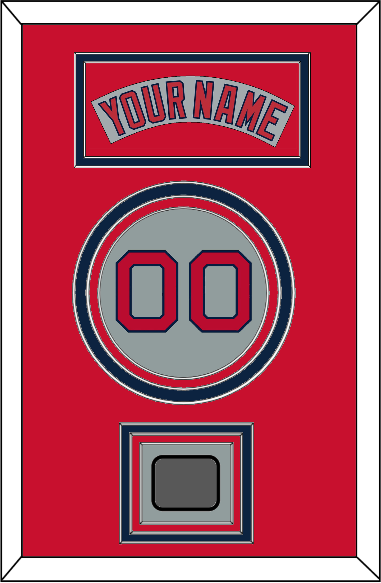Boston Road Gray Jersey (1992 Through 2008) Nameplate & Number With World Series Champions Patch - 2004, 2007, 2013 Or 2018.  Nameplate Is Double Mat Cut:  Red Mat Over A Blue Mat.  Gray Nameplate Mounted On A Red Mat.  To Match The Jersey, Number And Patch Are Triple Mat Cut:  Red Mat Over A Blue Mat Over A Red Mat, Red Number & World Series Patch Mounted On A Gray Mat.  White Or Black Frame.