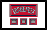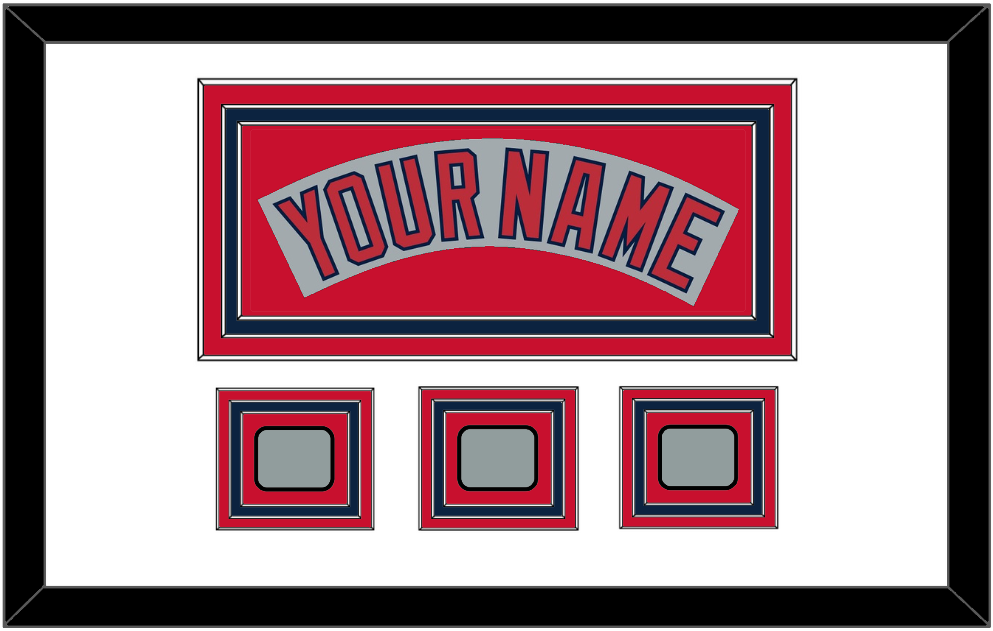 Boston Road Gray Jersey (1992 Through 2008) Nameplate With Three World Series Champions Patches (2004, 2007 & 2013 Or 2007, 2013 & 2018). Triple Mat Cut: White Mat Over A Red Mat Over A Blue Mat. Gray Nameplate & Patches Mounted On A Red Mat. Black Frame.