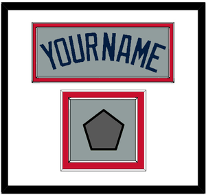 Boston Road Gray Jersey (2009 Through 2013) Name With 2004, 2007, 2013 Or 2018 World Series Jersey Patch. Double Mat Cut: White Mat Over A Red Mat With Blue Name & Patch Mounted On A Gray Mat. Black Frame.