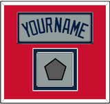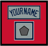 Boston Road Gray Jersey (2009 Through 2013) Name With 2004, 2007, 2013 Or 2018 World Series Jersey Patch. Double Mat Cut: Red Mat Over A Blue Mat With Blue Name & Patch Mounted On A Gray Mat. White Or Black Frame.