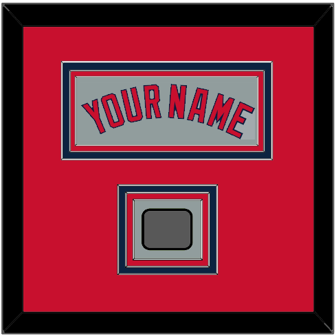 Boston Road Gray Jersey Name With 2004, 2007, 2013 Or 2018 World Series Jersey Patch. Triple Mat Cut: Red Mat Over A Blue Mat, Over A Red Mat. Red Name & Patch Mounted On A Gray Mat. White Or Black Frame.