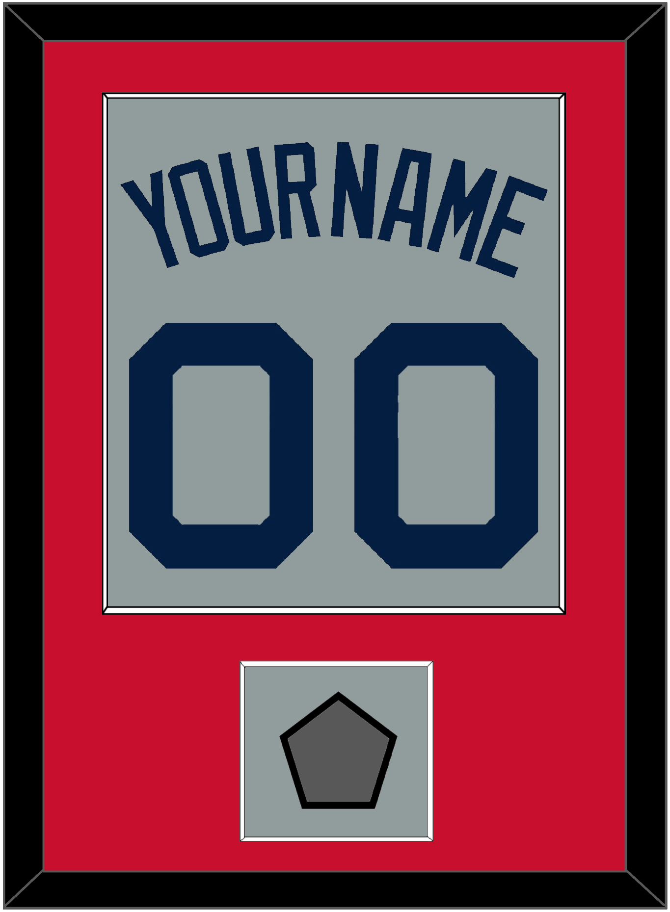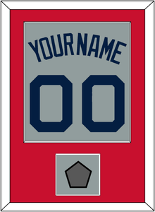 Boston Road Gray Jersey (2009 Through 2013) Name & Number With 2004, 2007, 2013 Or 2018 World Series Champions Patch. Single Mat Cut: Red Mat With Blue Name, Number & Patch Mounted On A Gray Mat. White Or Black Frame.