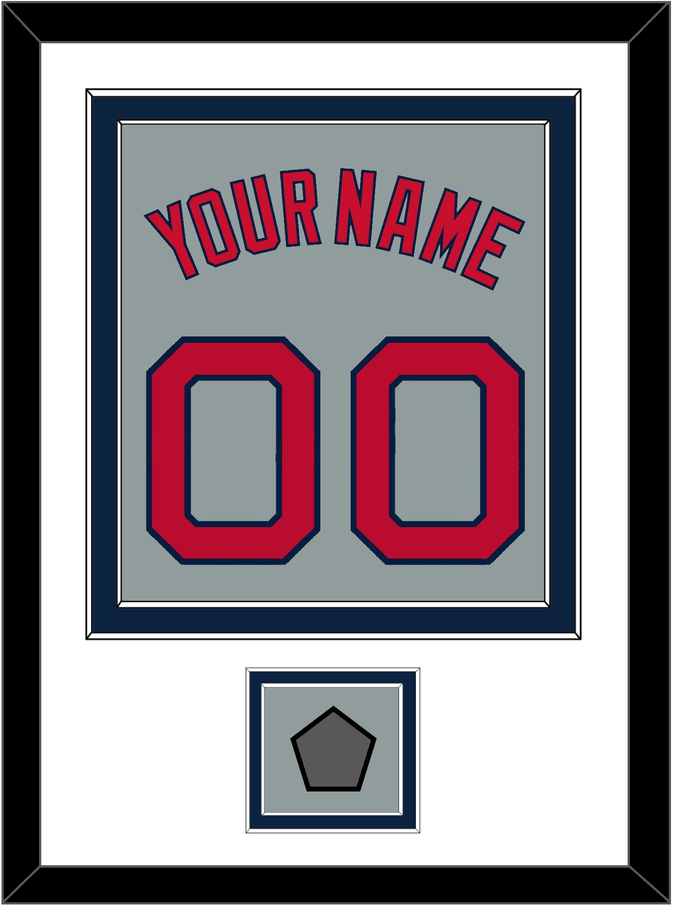 Boston Road Gray Jersey Name & Number With 2004, 2007, 2013 Or 2018 World Series Jersey Patch. Double Mat Cut: White Mat Over Blue Mat. Red Name, Number & Patch Mounted On A Gray Mat. Black Frame.