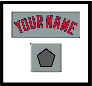 Boston Road Gray Jersey Name With 2004, 2007, 2013 Or 2018 World Series Champions Patch. Single Mat Cut: White Mat With Red Name & Patch Mounted On A Gray Mat. Black Frame.