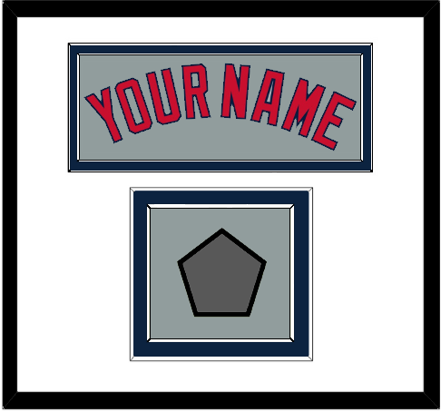 Boston Road Gray Jersey Name With 2004, 2007, 2013 Or 2018 World Series Jersey Patch. Double Mat Cut: White Mat Over A Blue Mat With Red Name & Patch Mounted On A Gray Mat. Black Frame.