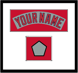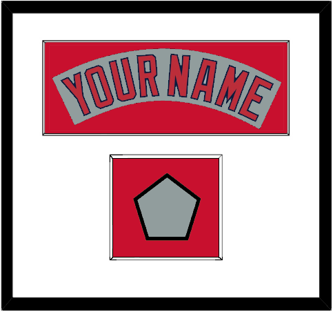 Boston Road Gray Jersey (1992 Through 2008) Nameplate With 2004, 2007, 2013 Or 2018 World Series Champions Patch. Single Mat Cut: White Mat With Gray Nameplate & Patch Mounted On A Red Mat. Black Frame.