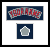 Boston Road Gray Jersey (1992 Through 2008) Nameplate With 2004, 2007, 2013 Or 2018 World Series Champions Patch. Single Mat Cut: White Mat With Gray Nameplate & Patch Mounted On A Blue Mat. Black Frame.