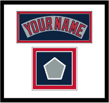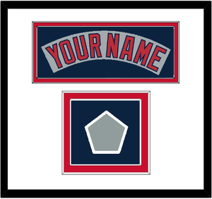 Boston Road Gray Jersey (1990 Through 2008) Nameplate With 2004, 2007, 2013 Or 2018 World Series Jersey Patch. Double Mat Cut: White Mat Over A Red Mat With Gray Nameplate & Patch Mounted On A Blue Mat. Black Frame.