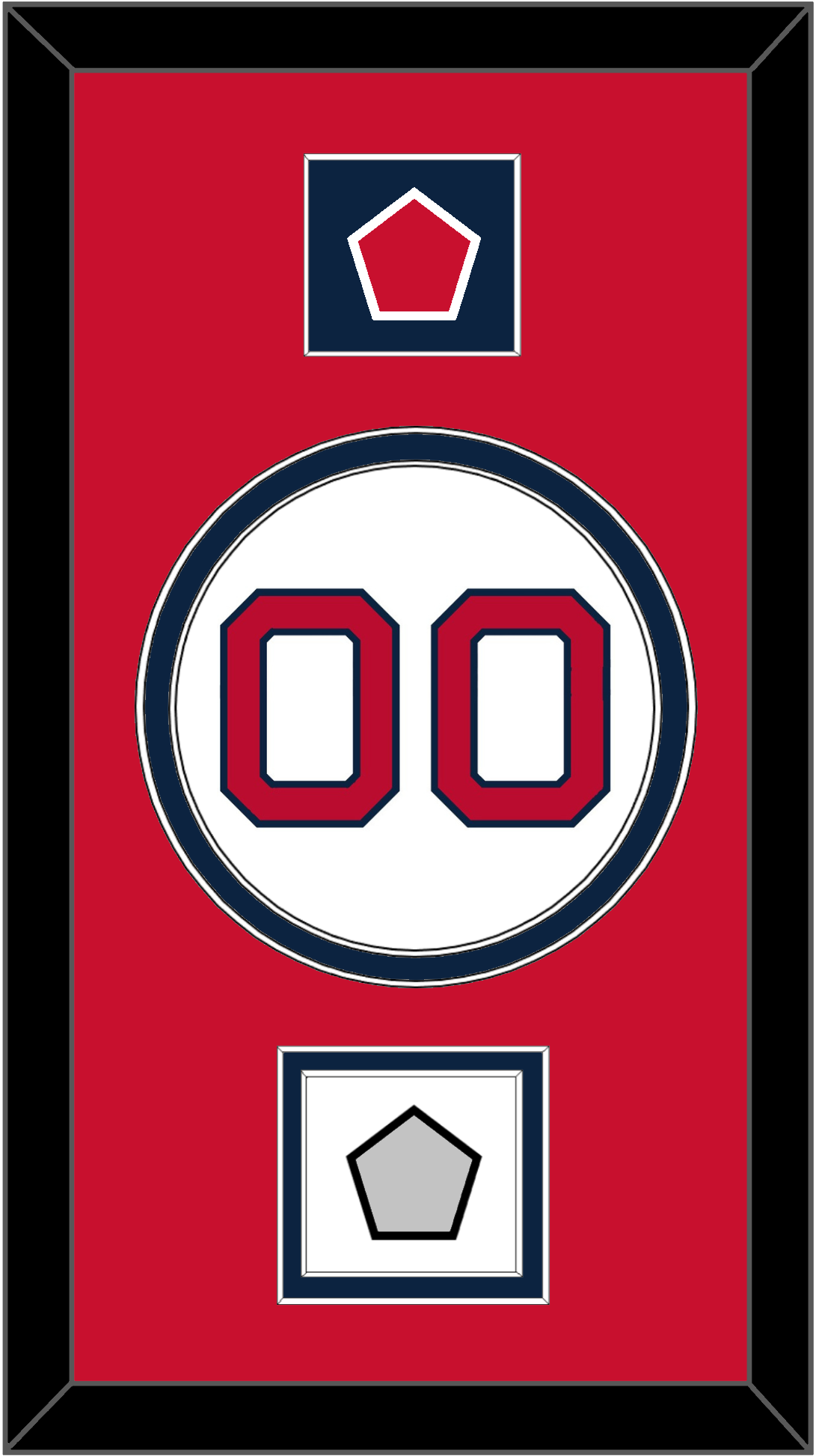 Boston Home White Jersey Number, “B” Hat Logo Patch & 2004, 2007, 2013 Or 2018 World Series Champions Patch. Hat Patch Is Single Mat Cut: Red Mat With Hat Patch Is Mounted On A Blue Mat. Number & World Series Patch Are Double Mat Cut: Red Mat Over A Blue Mat. Red Number Number & Patches Mounted On Pinstripes. White Or Black Frame.
