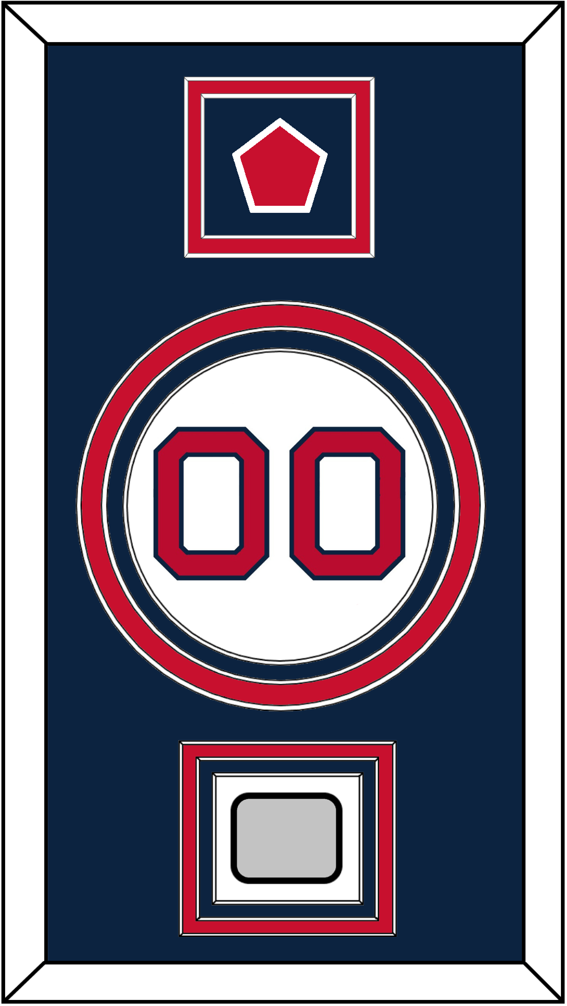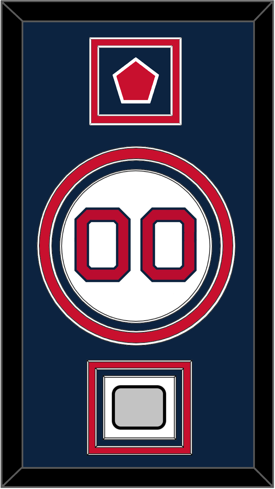 Boston Home White Jersey Number, “B” Hat Logo Patch & 2004, 2007, 2013 Or 2018 World Series Champions Patch. Hat Patch Is Double Mat Cut: Blue Mat Over A Red Mat. Hat Patch Is Mounted On A Blue Mat. Number & World Series Patch Are Double Mat Cut: Blue Mat Over A Red Mat Over A Blue Mat. Red Number Number & Patches Mounted On Pinstripes. White Or Black Frame.