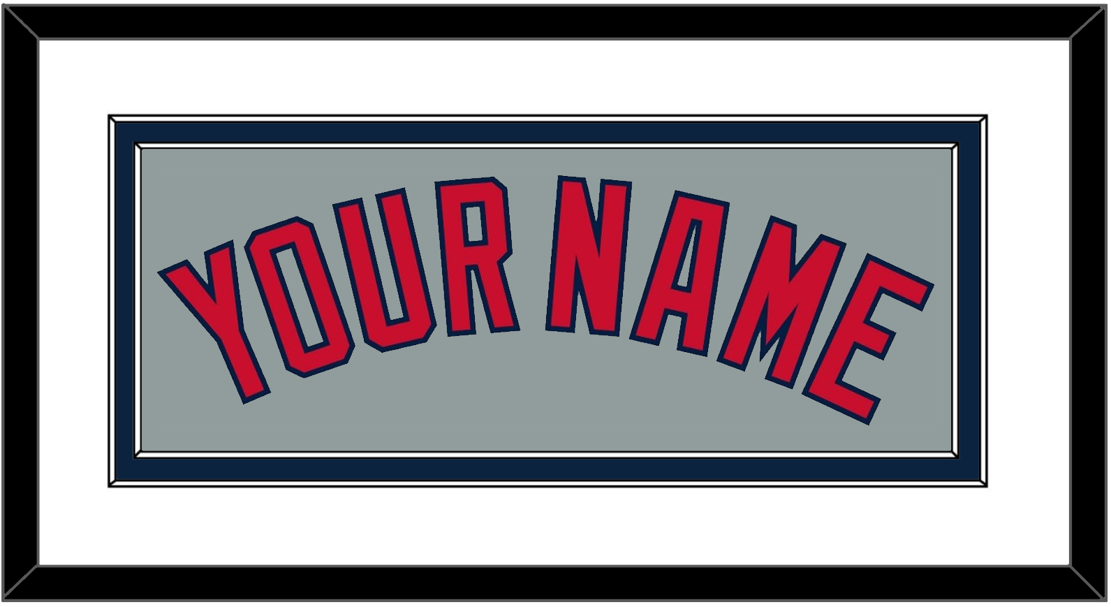Boston Road Gray Jersey Name. Double Mat: White Mat Over A Blue Mat. Red Name Mounted On Gray Mat. Black Frame.