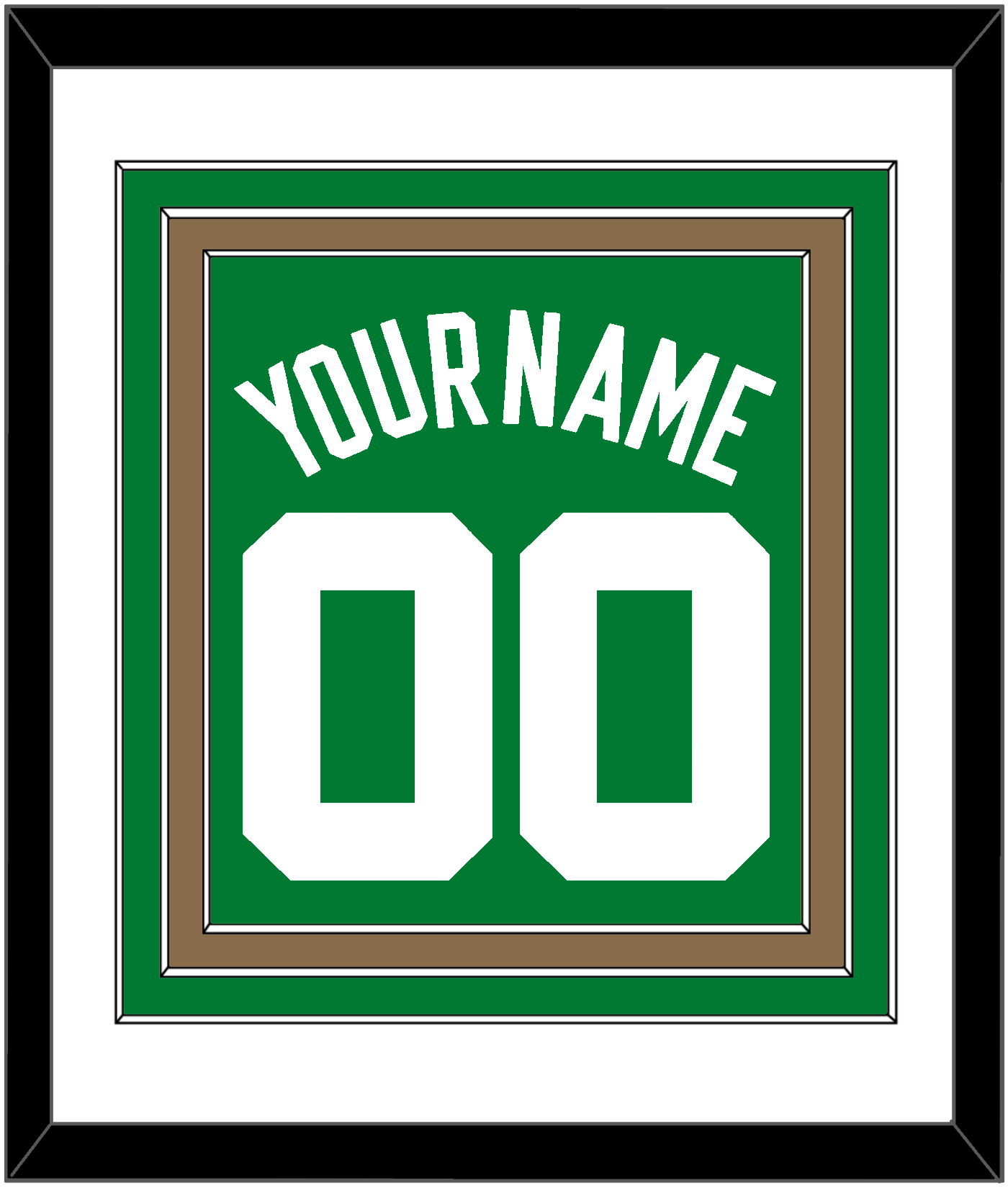 Boston Road Green Jersey (1972 Through 2018) Name & Number.  Triple Mat:  White Mat Over A Green Mat Over A Gold Mat.  White Name And Number Mounted On Green Mat.  Black Frame.