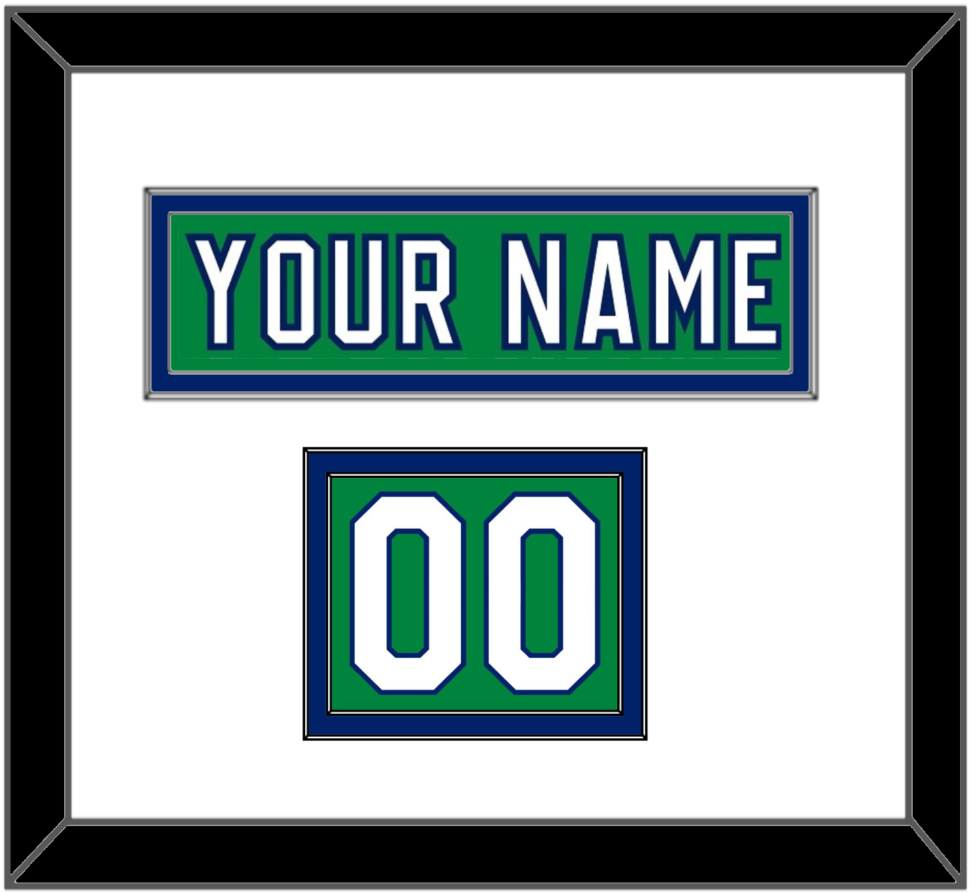 Carolina Heritage Green Jersey (2018 Through 2023) Nameplate & Numbers From Shoulder - The Nameplate Is Single Mat Cut: Green Nameplate Mounted On Blue Mat. To Match The Jersey, The Numbers Are Double Mat Cut: White Mat Over A Blue Mat. White Numbers Mounted On A Green Mat. Black Frame.