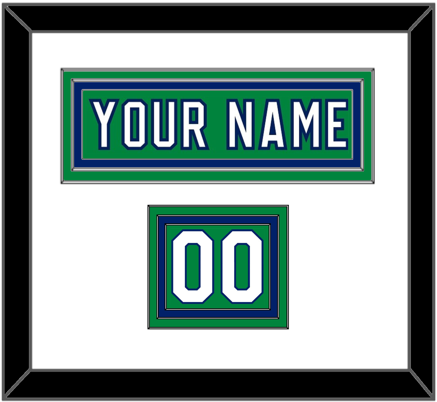 Carolina Heritage Green Jersey (2018 Through 2023) Nameplate & Numbers From Shoulder - The Nameplate Is Double Mat Cut: White Mat Over A Green Mat, Green Nameplate Mounted On Blue Mat. To Match The Jersey, The Numbers Are Triple Mat Cut: White Mat Over A Green Mat, Over Blue Mat. White Numbers Mounted On A Green Mat. Black Frame.