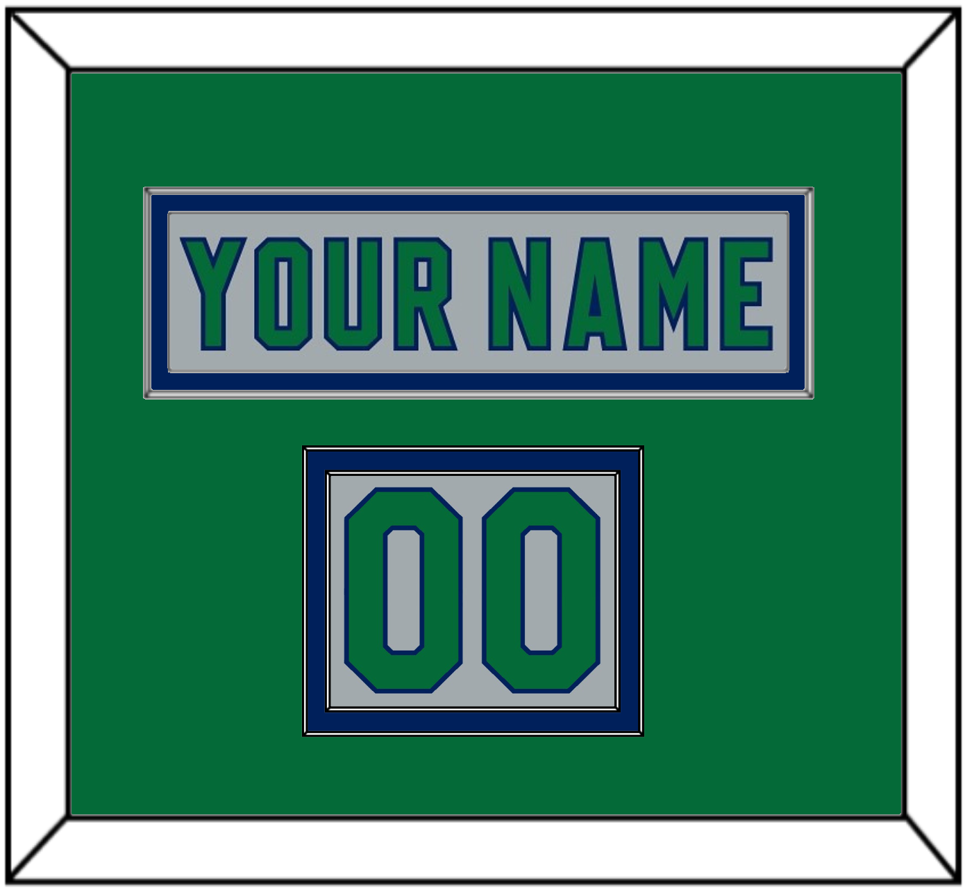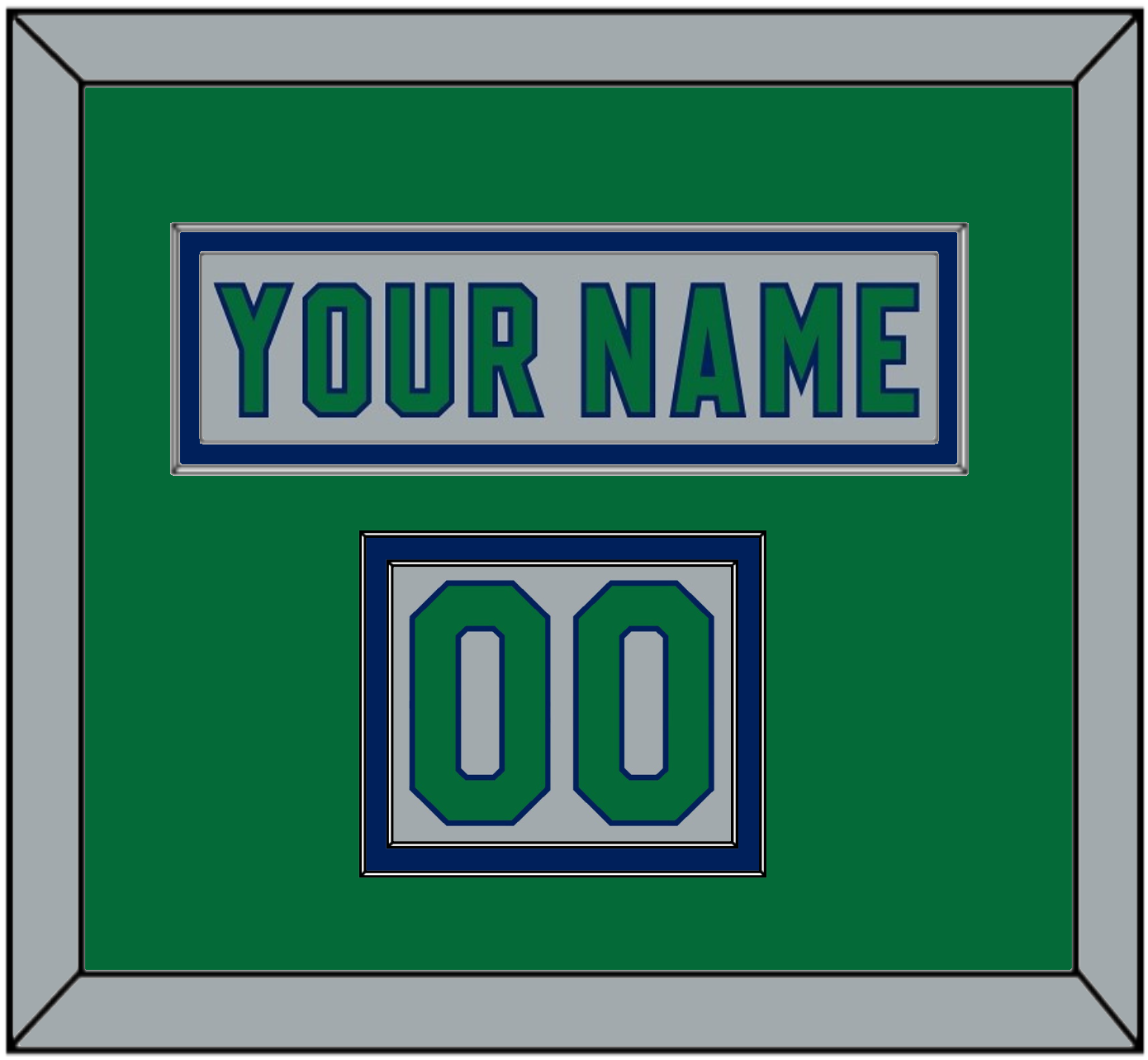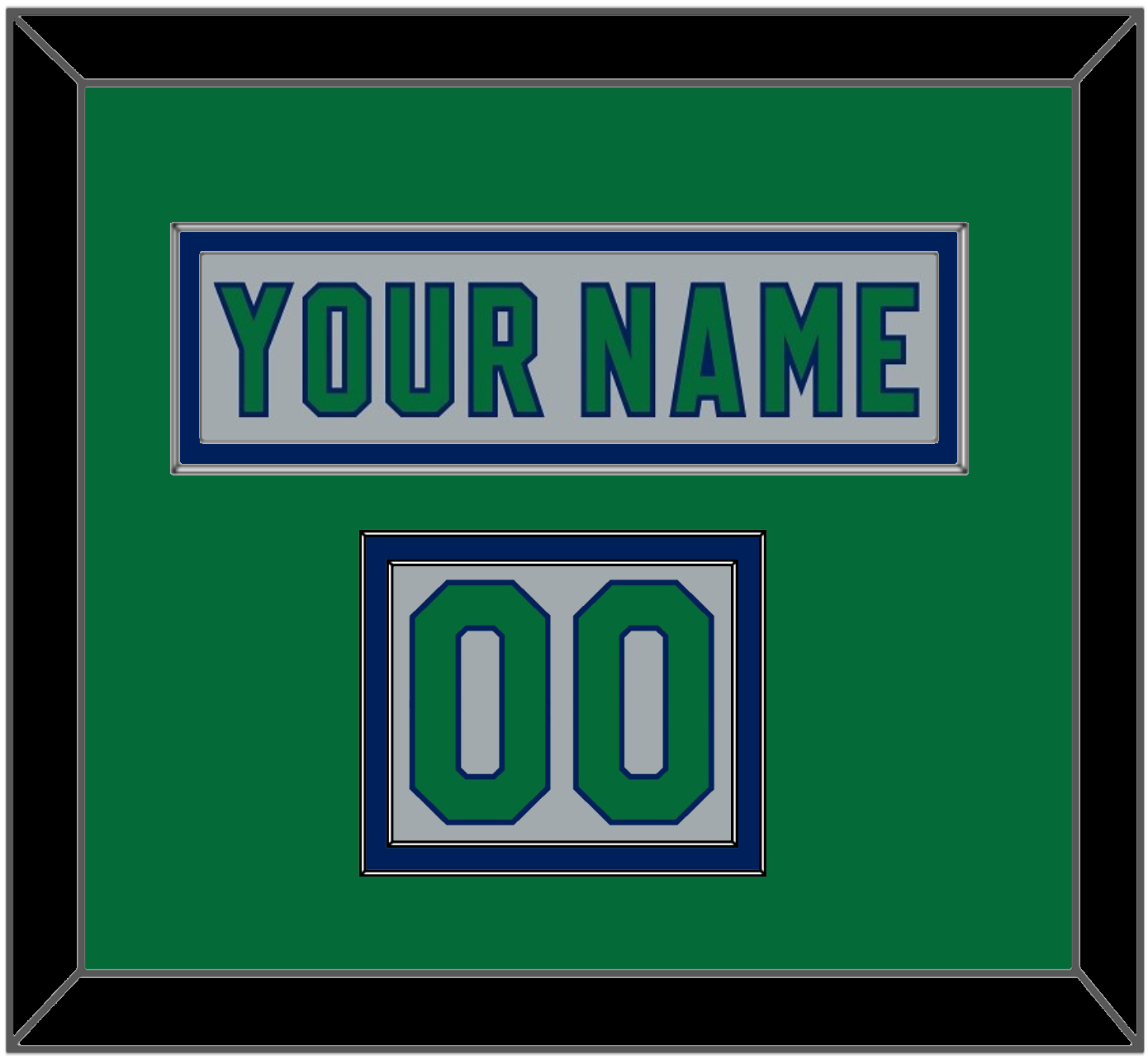 Carolina Reverse Retro Gray Jersey (2020 Through 2021) Nameplate & Numbers From Shoulder - The Nameplate Is Single Mat Cut: Gray Nameplate Mounted On Blue Mat. To Match The Jersey, The Numbers Are Double Mat Cut: Green Mat Over A Blue Mat. Green Numbers Mounted On A Gray Mat. White, Black Or Silver (Metal) Frame.