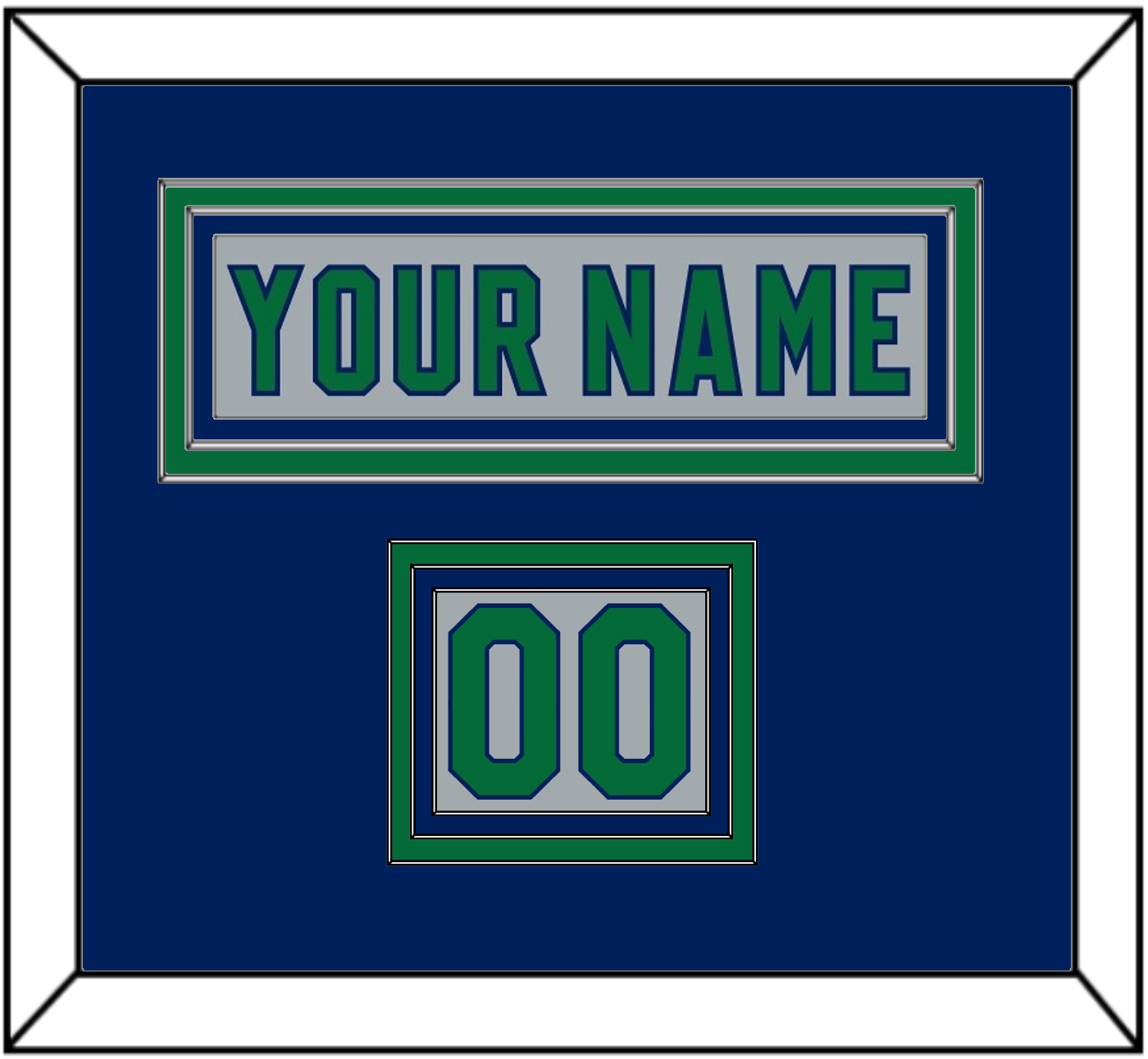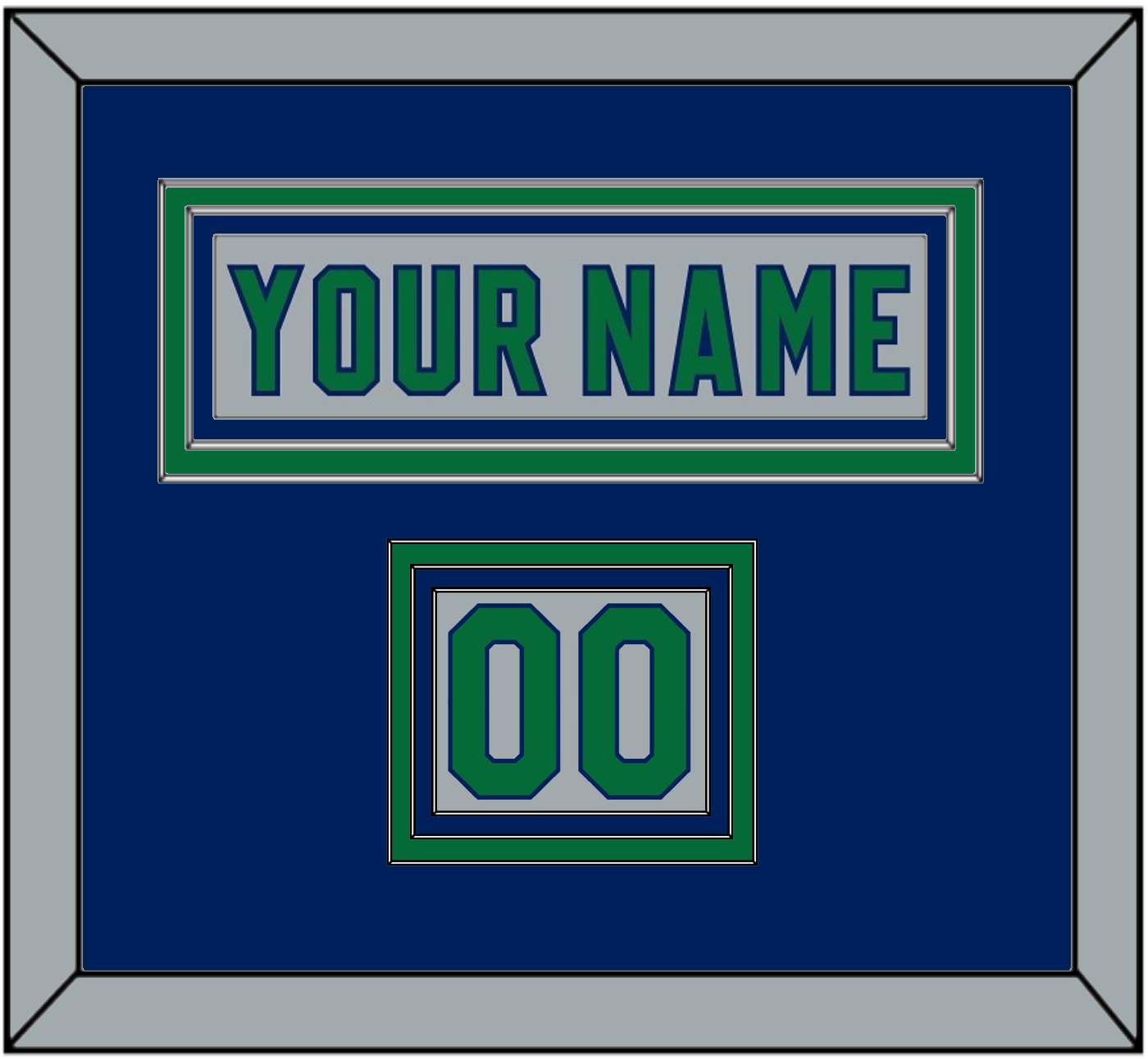 Carolina Reverse Retro Gray Jersey (2020 Through 2021) Nameplate & Numbers From Shoulder - The Nameplate Is Double Mat Cut: Blue Mat Over A Green Mat, Gray Nameplate Mounted On Blue Mat. To Match The Jersey, The Numbers Are Triple Mat Cut: Blue Mat Over A Green Mat, Over Blue Mat. Green Numbers Mounted On A Gray Mat. White, Black Or Silver (Metal) Frame.