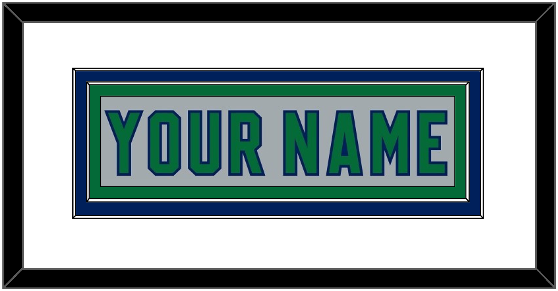 Carolina Reverse Retro Gray Jersey (2020 Through 2021) Nameplate. Double Mat: White Mat Over Blue Mat, Gray Nameplate Mounted On Green Mat. Black Frame.