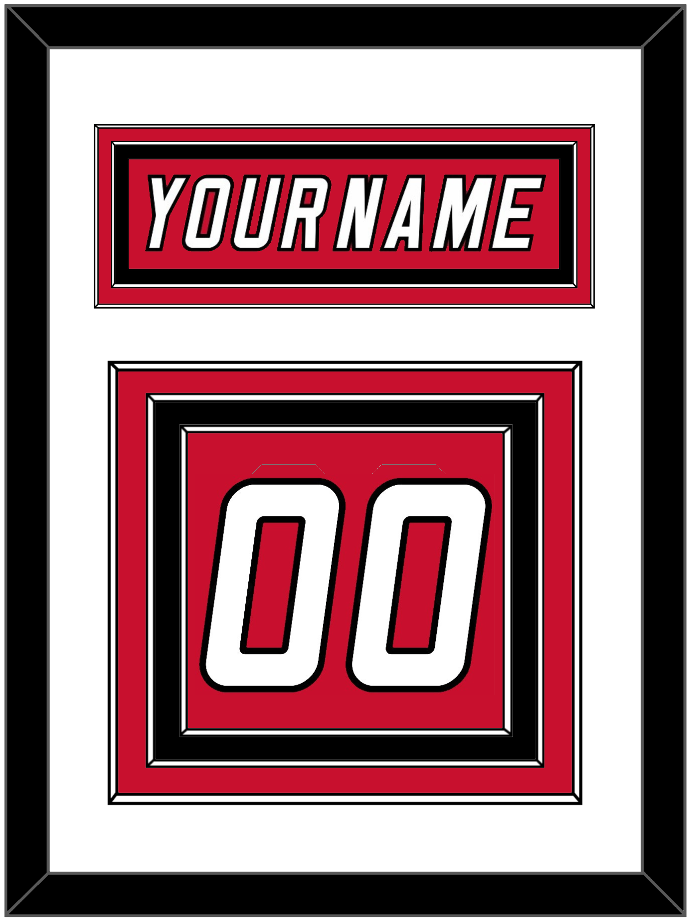 Carolina Alternate Red Jersey (2022 Through 2023) Nameplate & Numbers (From The Back Of The Jersey). Nameplate Is Double Mat Cut: White Mat Over A Red Mat. Red Nameplate Mounted On A Black Mat. To Match The Jersey, Number Is Triple Mat Cut: White Mat Over A Red Mat Over A Black Mat, White Number Mounted On A Red Mat. Black Frame.