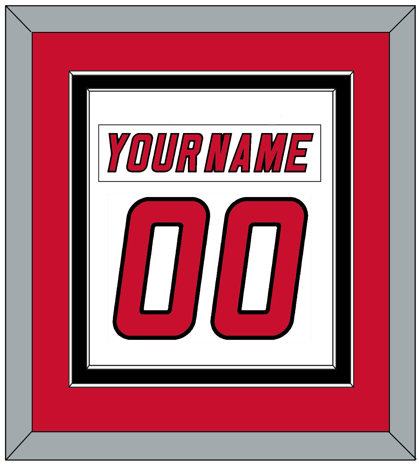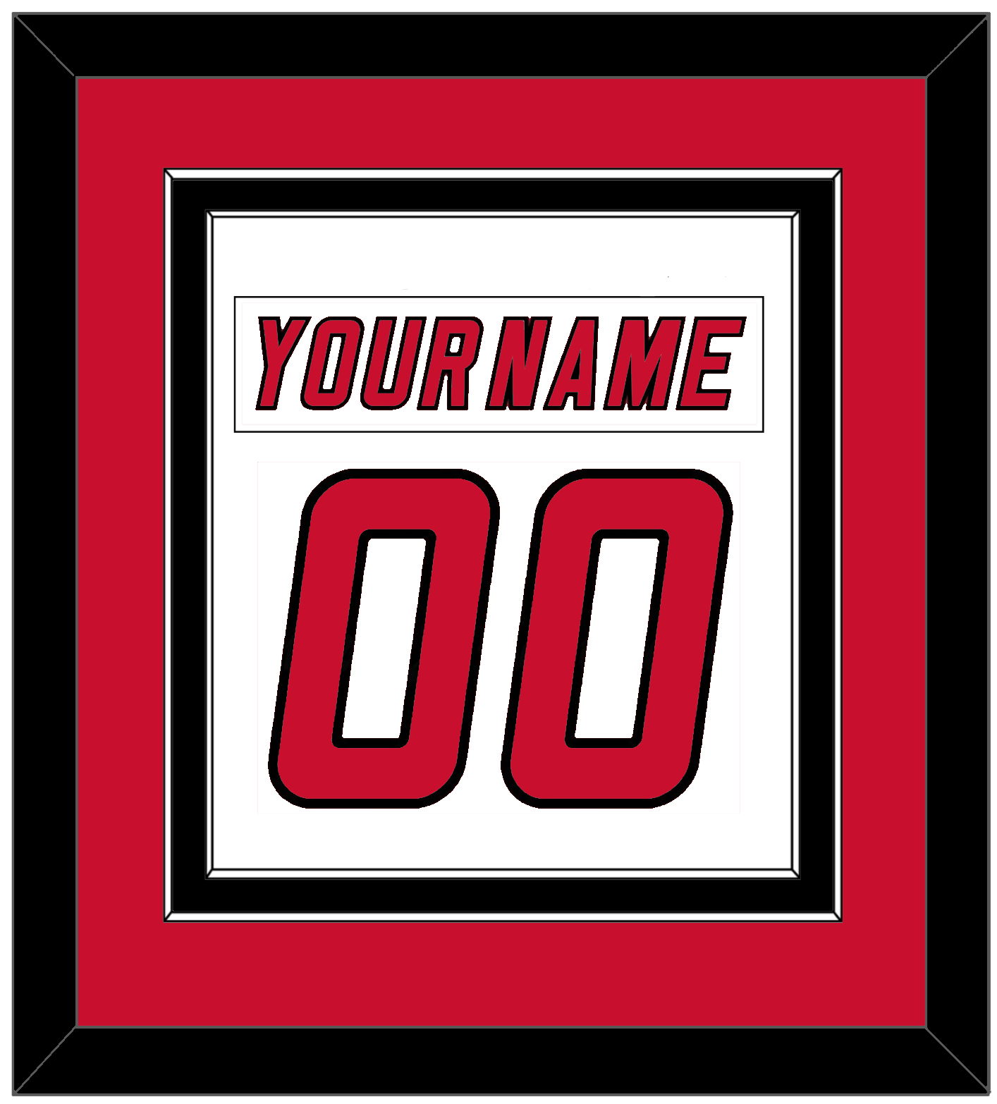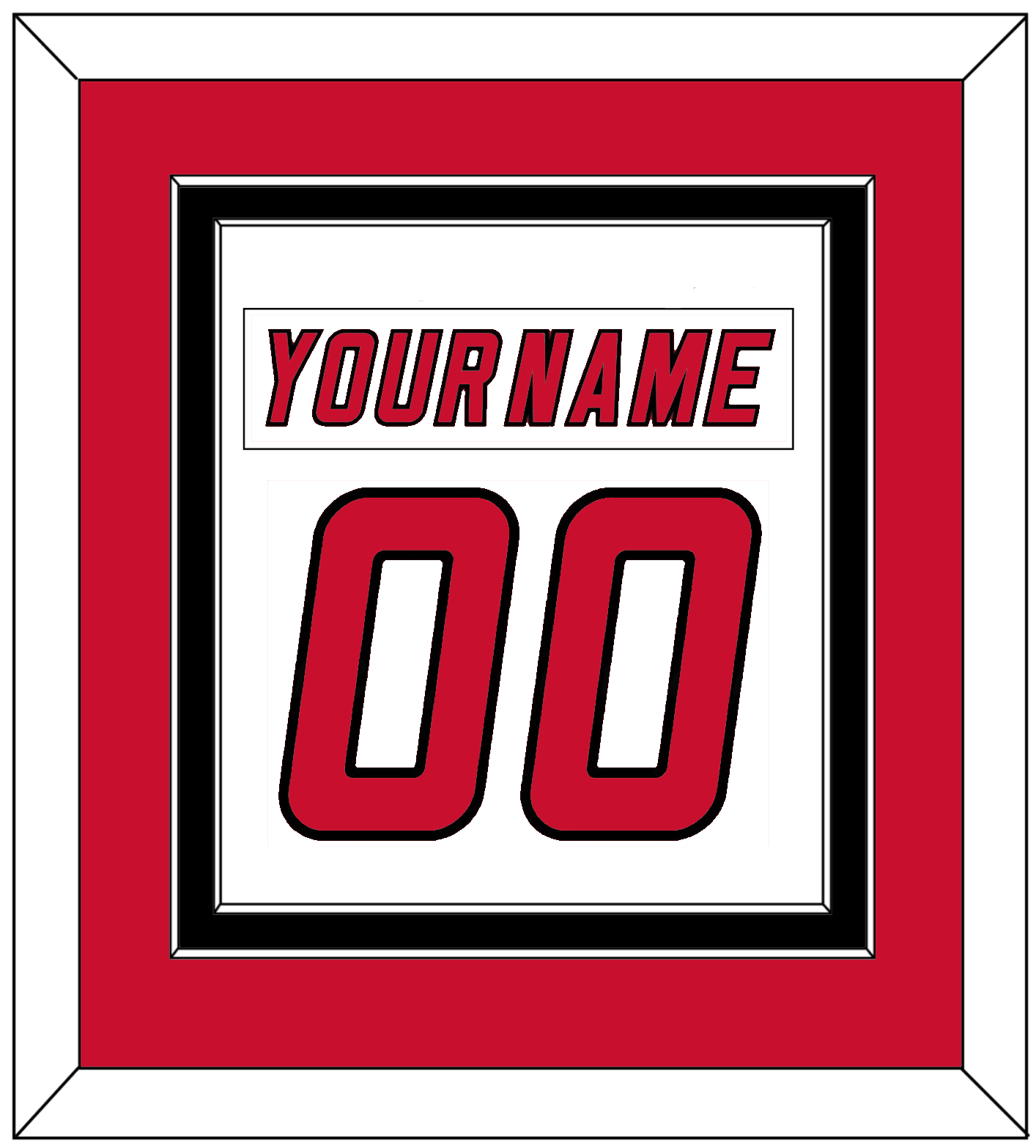Carolina Home / Road White Jersey (2000 Through 2007) Nameplate & Number (From The Back Of The Jersey). Double Mat Cut: Red Mat Over A Black Mat. White Nameplate And Red Number Mounted On A White Mat. Black, White Or Silver (Metal) Frame.