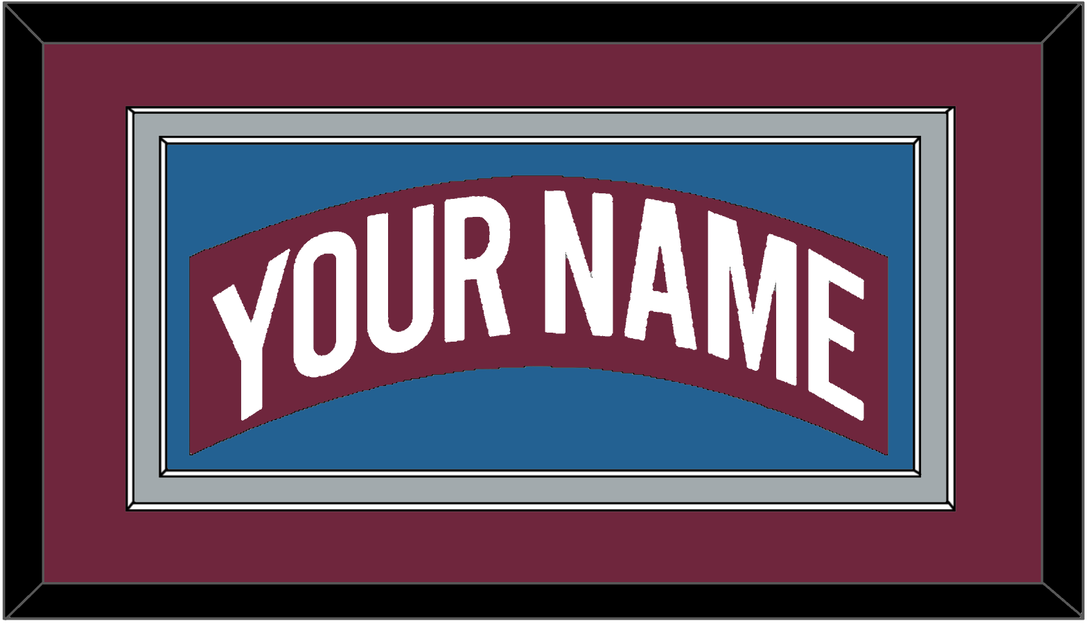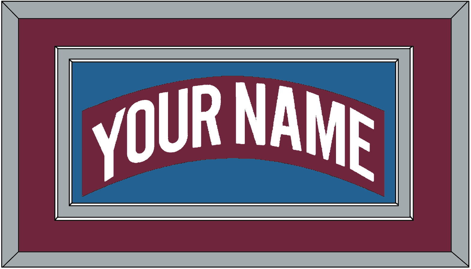 Colorado Road Burgundy Jersey (1999 Through 2001) Nameplate. Double Mat: Burgundy Mat Over Gray Mat. Burgundy Nameplate Mounted On Blue Mat. White, Black Or Silver (Metal) Frame.