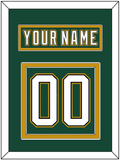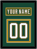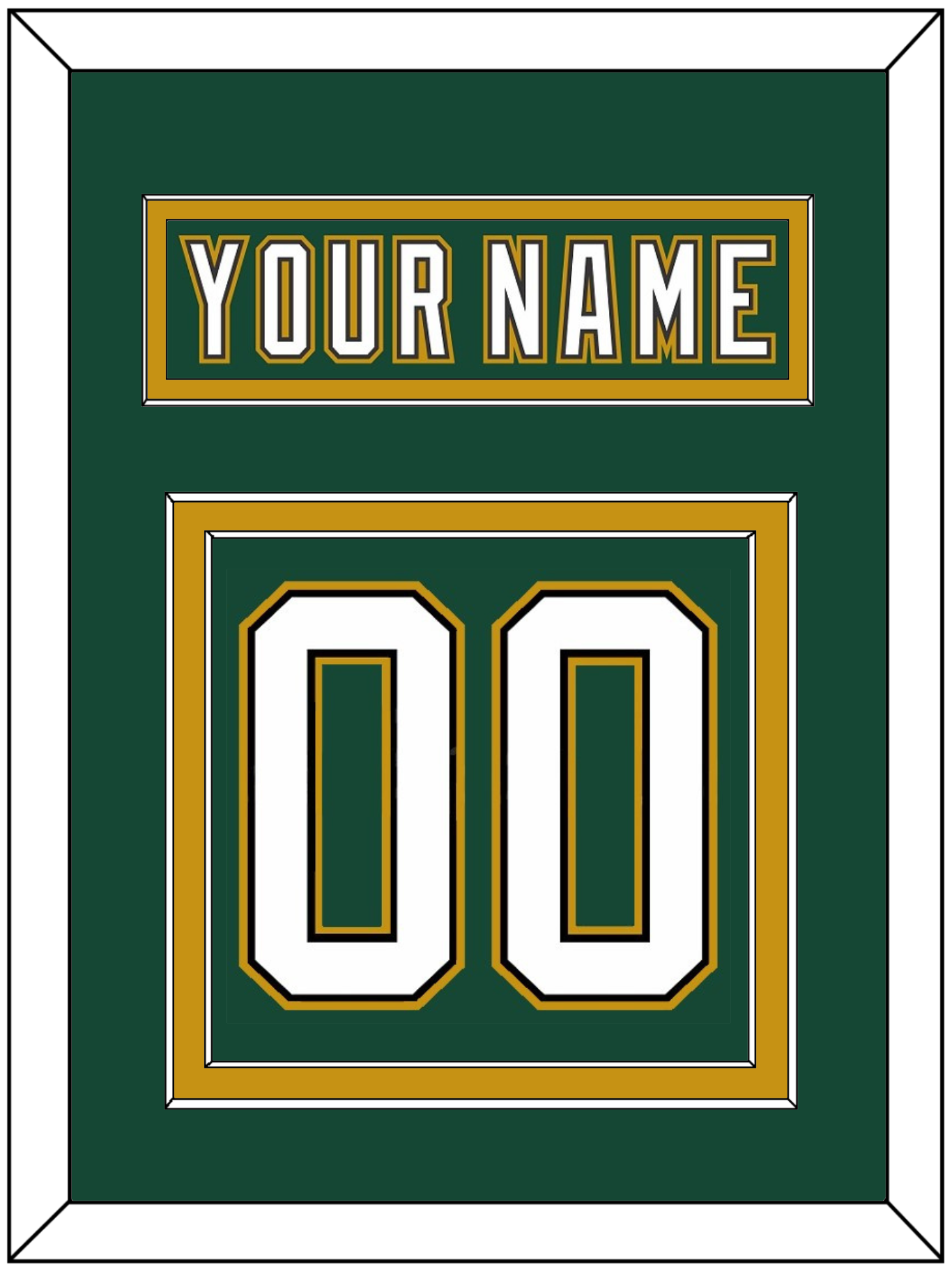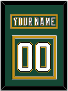 Dallas Alternate Green Jersey (1997 Through 1999) Nameplate & Numbers (From The Back Of The Jersey). Nameplate Is Single Mat Cut: Green Mat With Green Nameplate Mounted On A Gold Mat. To Match The Jersey, Number Is Double Mat Cut: Green Mat Over A Gold Mat, White Number Mounted On A Green Mat. Black Or White Frame.