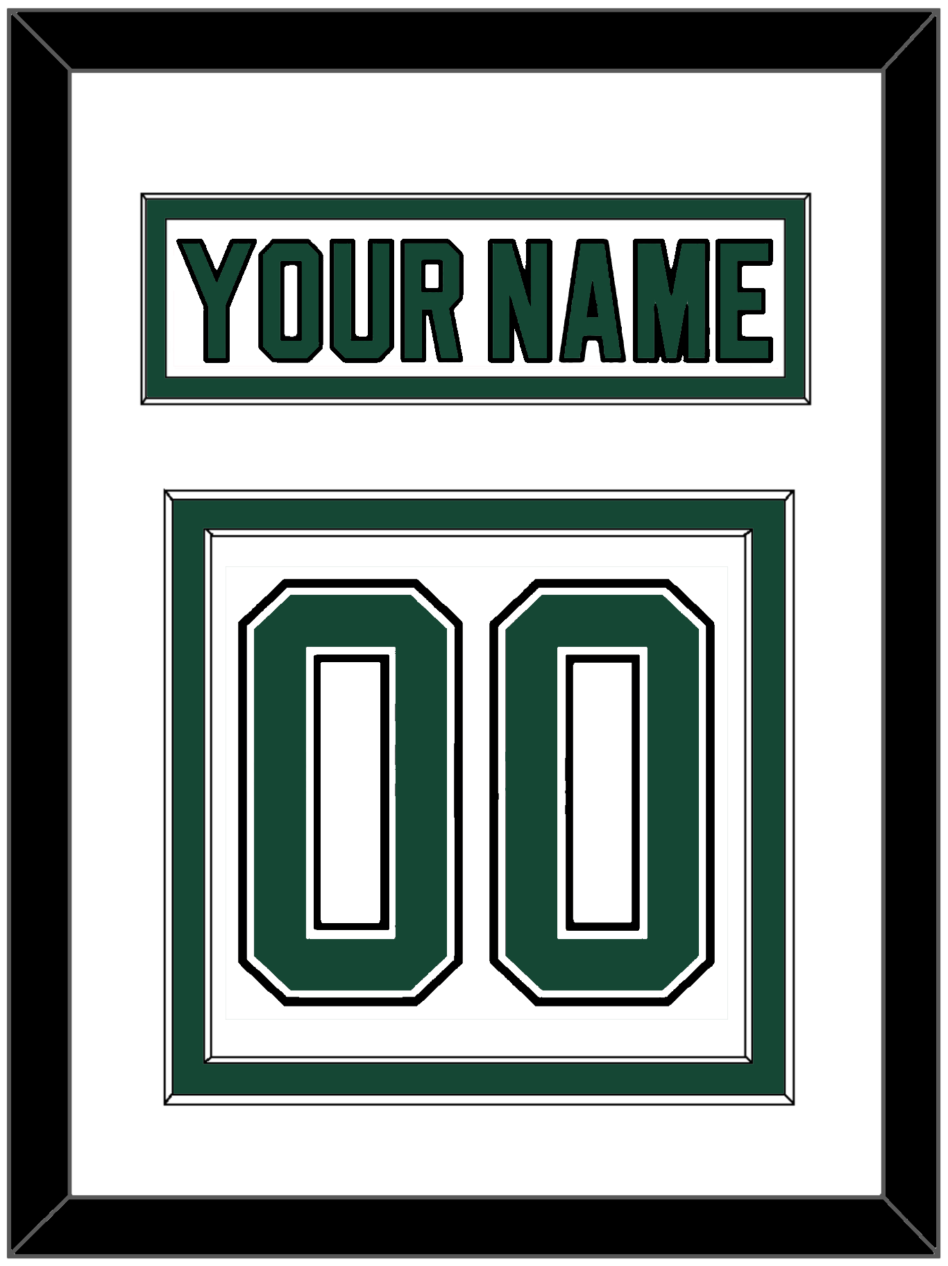 Dallas Home White Jersey (1994 Through 1999) Nameplate & Numbers (From The Back Of The Jersey). Nameplate Is Single Mat Cut: White Mat With White Nameplate Mounted On A Green Mat. To Match The Jersey, Number Is Double Mat Cut: White Mat Over A Green Mat, Green Number Mounted On A White Mat. Black Frame.