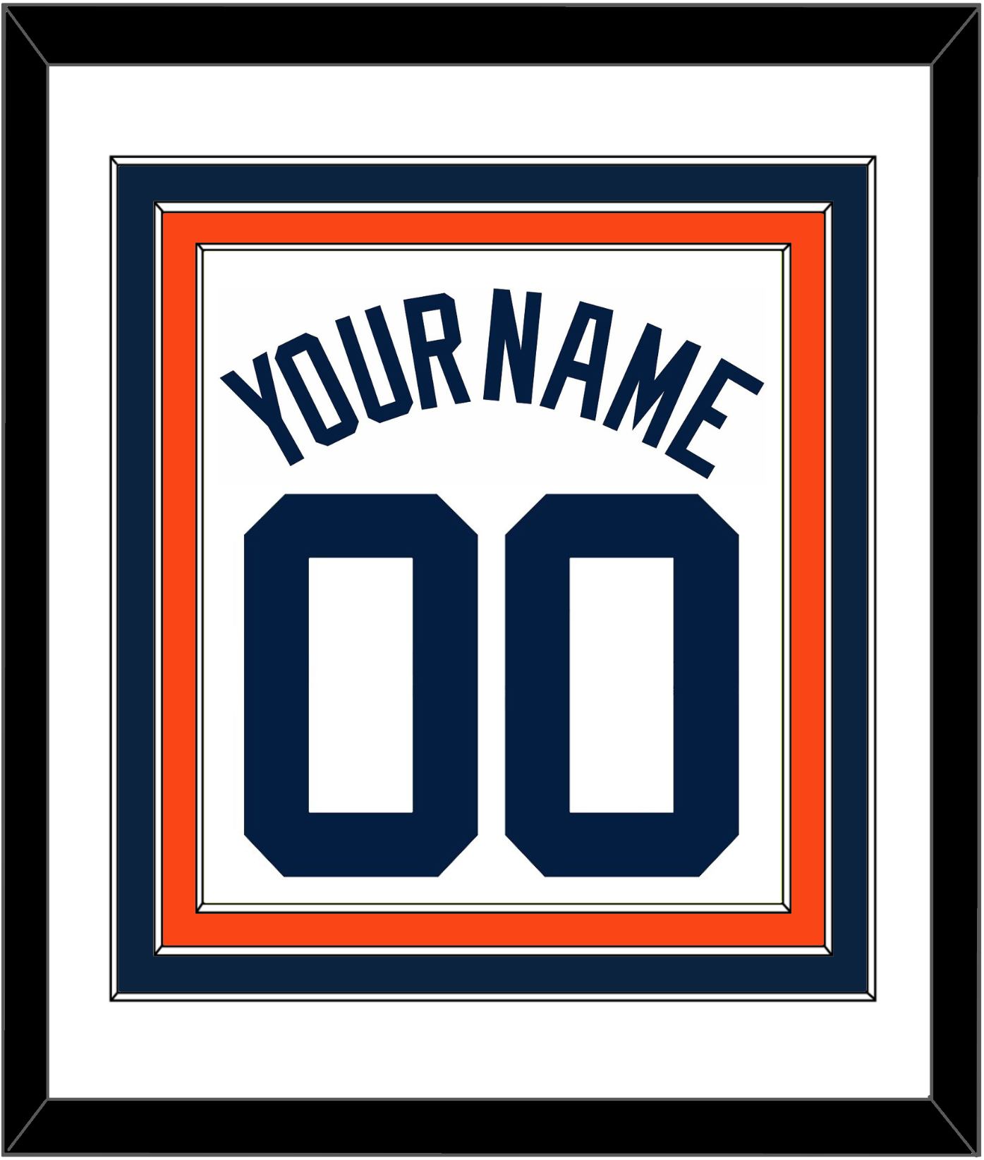 Detroit Home White Jersey (1972 Through 2017) Name & Number. Triple Mat: White Mat Over An Orange Mat Over A Blue Mat. Name And Number Mounted On A White Mat. Black Frame.
