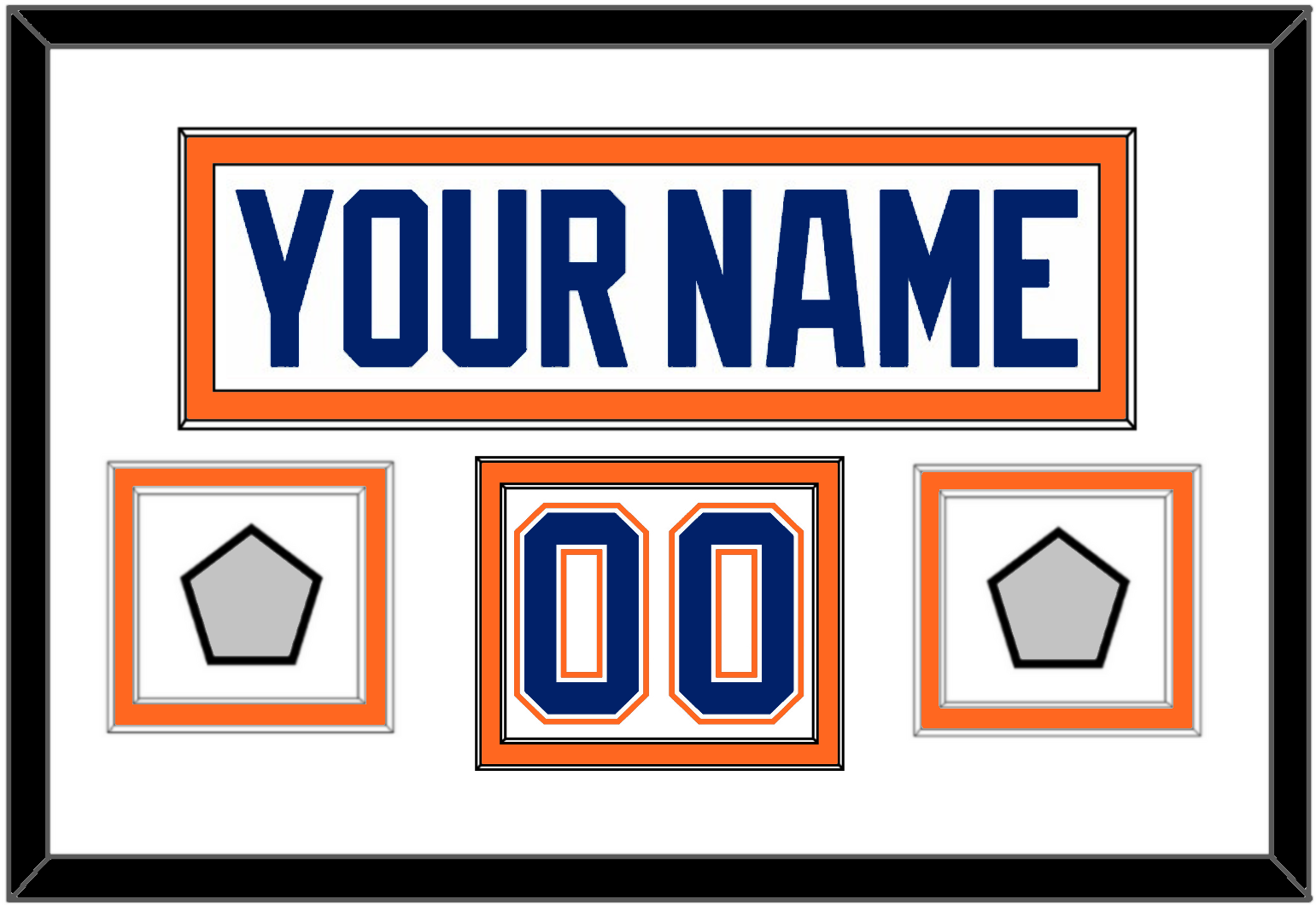 Edmonton Home White Jersey (1981 Through 1994) Nameplate, Numbers From Shoulder, & 2 Stanley Cup Champions Patches (1984 & 1985, 1985 & 1987, 1987 & 1988 Or 1988 & 1990). The Nameplate Is Single Mat Cut: White Nameplate Mounted On An Orange Mat. To Match The Jersey, The Numbers & Patches Are Double Mat Cut: White Mat Over An Orange Mat. Blue Number & Patches Mounted On A White Mat. Black Frame.