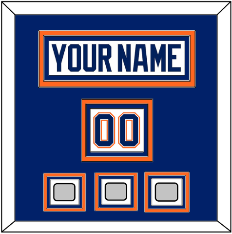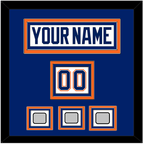 Edmonton Home White Jersey (1981 Through 1994) Nameplate, Numbers From Shoulder, & 3 Stanley Cup ChampionsPatches (1984, 1985 & 1987; 1985, 1987 & 1988; Or 1987, 1988 & 1990). The Nameplate Is Double Mat Cut: Blue Mat Over An Orange Mat. White Nameplate Mounted On A Blue Mat. To Match The Jersey, The Numbers & Patches Are Triple Mat Cut: Blue Mat Over An Orange Mat Over A Blue Mat. Blue Number & Patches Mounted On A White Mat. White Or Black Frame.