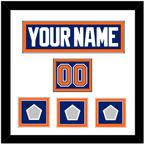 Edmonton Road Blue Jersey (1981 Through 1994) Nameplate, Numbers From Shoulder, & 3 Stanley Cup Champions Patches (1984, 1985 & 1987; 1985, 1987 & 1988; Or 1987, 1988 & 1990). The Nameplate Is Single Mat Cut: Blue Nameplate Mounted On An Orange Mat. To Match The Jersey, The Numbers & Patches Are Double Mat Cut: White Mat Over An Orange Mat. White Number & Patches Mounted On A Blue Mat. Black Frame.