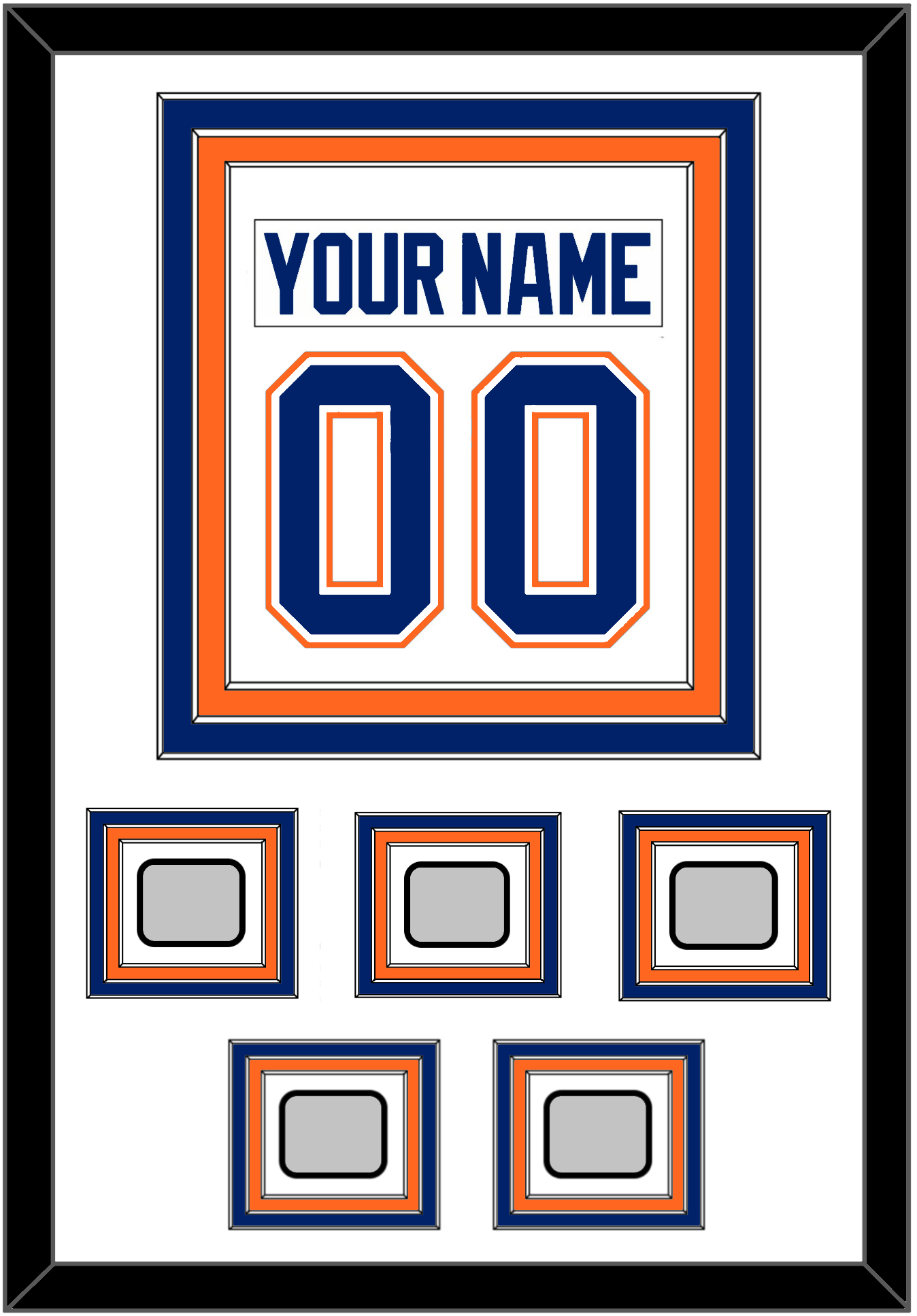 Edmonton Home White Jersey (1981 Through 1994) Nameplate & Number (From The Back Of The Jersey) With 1984, 1985, 1987, 1988 & 1990 Stanley Cup Champions Patches. Triple Mat Cut: White Mat Over A Blue Mat Over An Orange Mat. White Nameplate, Blue Number & Patches Mounted On A White Mat. Black Frame.