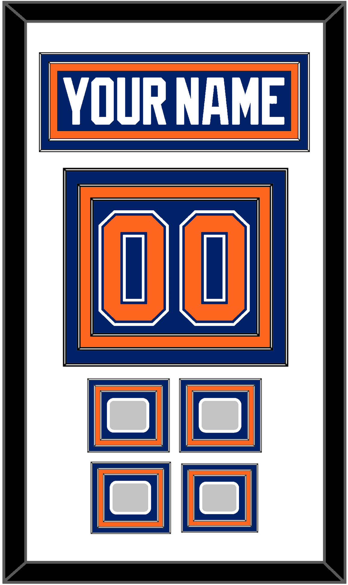 Edmonton Road Blue Jersey (1981 Through 1994) Nameplate & Numbers (From The Back Of The Jersey) With 1984, 1985, 1987 & 1988; Or 1985, 1987, 1988 & 1990 Stanley Cup Champions Patches. Nameplate Is Double Mat Cut: White Mat Over A Blue Mat. Blue Nameplate Mounted On An Orange Mat. To Match The Jersey, Number & Patches Are Triple Mat Cut: White Mat Over A Blue Mat Over An Orange Mat, Orange Number & Patches Mounted On A Blue Mat. Black Frame.