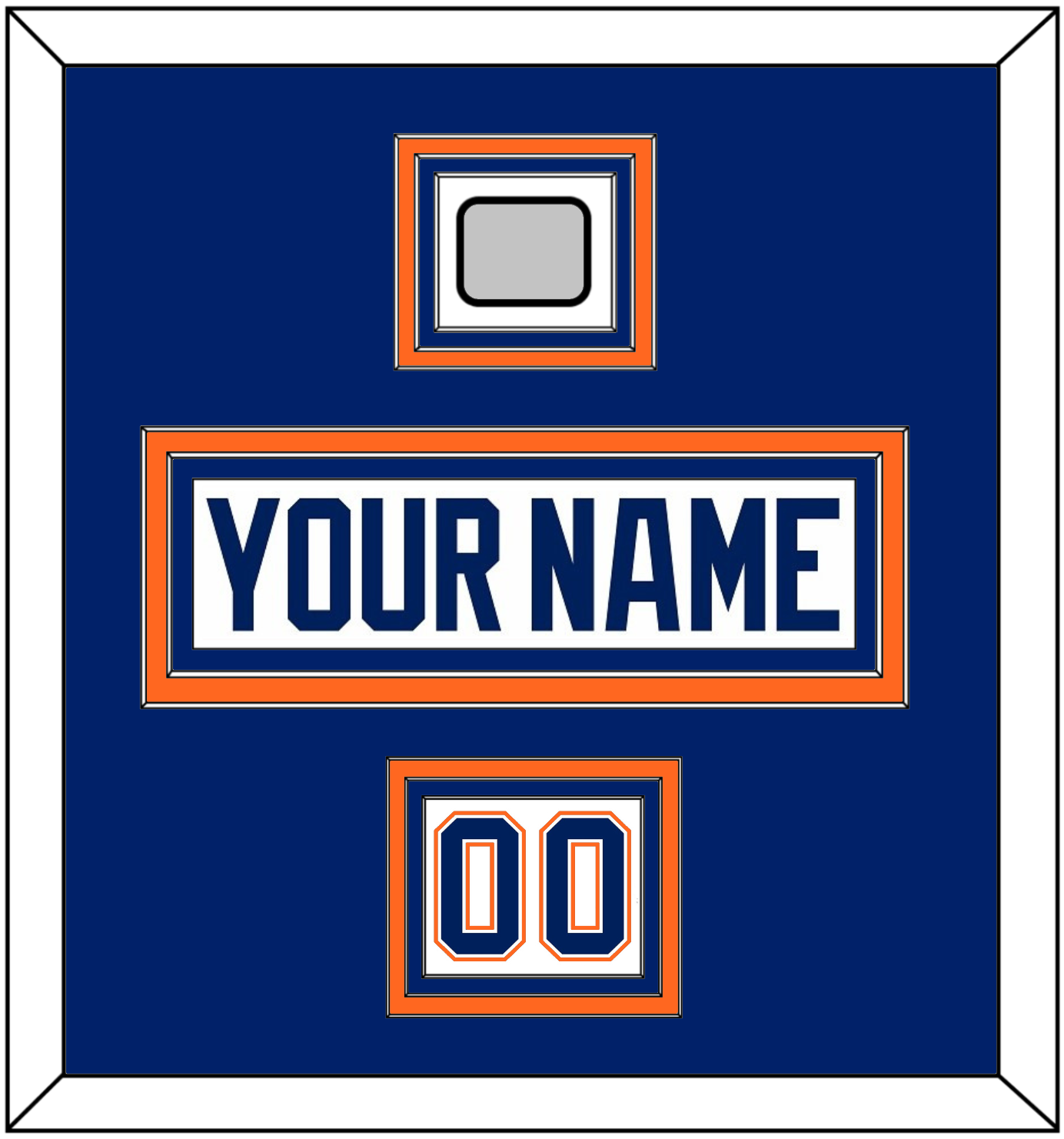 Edmonton Home White Jersey (1981 Through 1994) Nameplate, Number(s) From Shoulder, & 1984, 1985, 1987, 1988 Or 1990 Stanley Cup Champions Patch.  The Nameplate Is Double Mat Cut:  Blue Mat Over An Orange Mat, White Nameplate Mounted On A Blue Mat.  To Match The Jersey, The Numbers & Patches Are Triple Mat Cut:  Blue Mat Over An Orange Mat Over A Blue Mat, Blue Numbers & Patch Mounted On A White Mat.  White Or Black Frame.