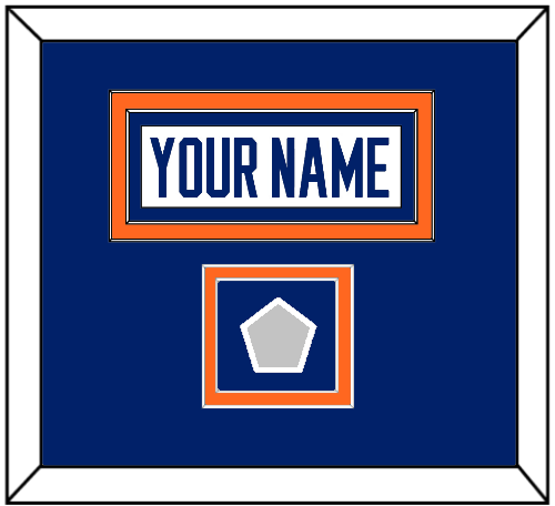 Edmonton Home White Jersey (1981 Through 1994) Nameplate With 1984, 1985, 1987, 1988 Or 1990 Stanley Cup Champions Patch. Double Mat Cut: Blue Mat Over An Orange Mat With White Nameplate & Patch Mounted On A Blue Mat. White Or Black Frame.